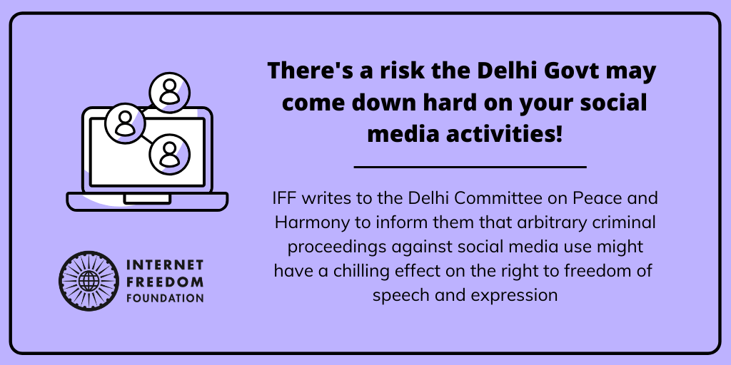 Earlier this week, the Delhi Government constituted a Committee for Peace and Harmony to investigate triggers which enabled last month’s Delhi riots. The Committee has already identified the proliferation of inciteful messaging across social networking platforms as a leading cause for the coordinated violence administered across North East Delhi. As a result the Committee intends to probe online hate speech and misinformation which is shared by social media users online. After a process of validation the Committee will forward complaints to the police and relevant authorities for formal investigation/prosecution. However, the Committee’s reporting mechanism, the vague nature of the punishable activity and the degree of punishment lends itself to risks of over censorship and chilling effect. IFF has written a letter to the Committee’s chairperson along with copies to Delhi Chief Minister Arvind Kejriwal and IT Minister Kailash Gahlot. In it we have expressed concerns of how arbitrary criminal proceedings with vaguely defined grounds are incompatible with constitutional thresholds of free speech and expression. We have suggested corrective measures and apprised the Committee of established standards of incitement as articulated at international fora.