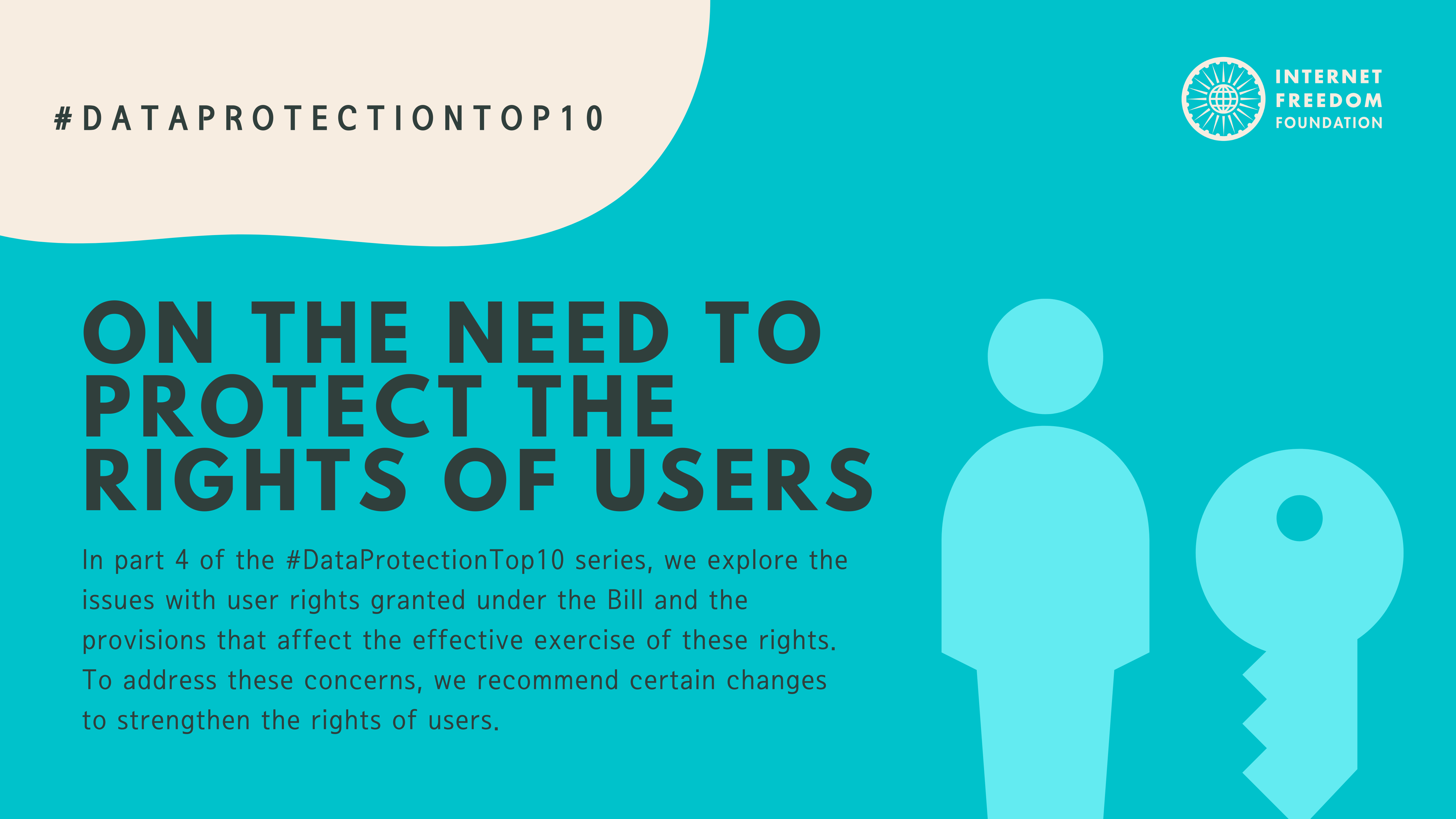 In part 4 of the #DataProtectionTop10 series, we explore the issues with the user rights granted under the Bill and the provisions that affect the effective exercise of these rights. Certain rights under the Bill, specifically, the right to correction and erasure and the right to data portability are not absolute and contain significant exemptions. The Bill also fails to include certain rights like the right to object to the processing of certain personal data and the right to seek exemption from automated decision making. To address these concerns, we recommend certain changes to strengthen the rights of users.
