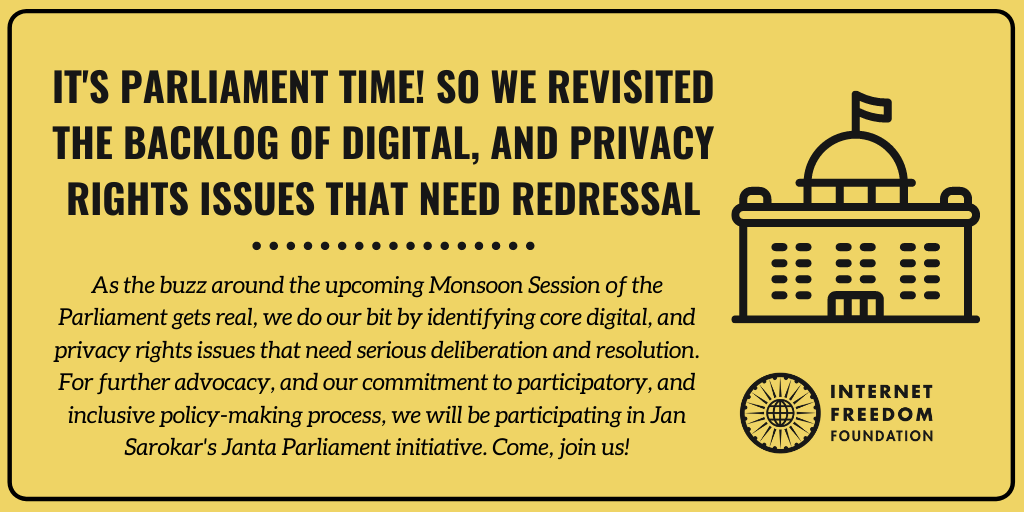It has been rumoured that to ensure that social distancing protocols are followed, each wing of the Parliament (the Lok Sabha and the Rajya Sabha) might sit for business on alternate days --- with each wing using up halls of both the Lok Sabha and Rajya Sabha to ensure safe social distancing. On the other hand, a similar scheme but with a morning and evening shift instead of alternate days has also been suggested by some sources. Given the backlog of urgent issues the second approach is a more preferable option since the former would amount to half the time for deliberation in comparison. Whatever route is taken, it is obvious that prioritisation of issues, and procedural efficiency may dominate this session. We, sincerely believe that this is possible while maintaining a healthy balance deliberative and considered debate. To aid in this effort we have identified several core digital rights issues which may benefit from parliamentary scrutiny. This is only the first step and we intend to follow this up with correspondence with the treasury and the opposition benches.