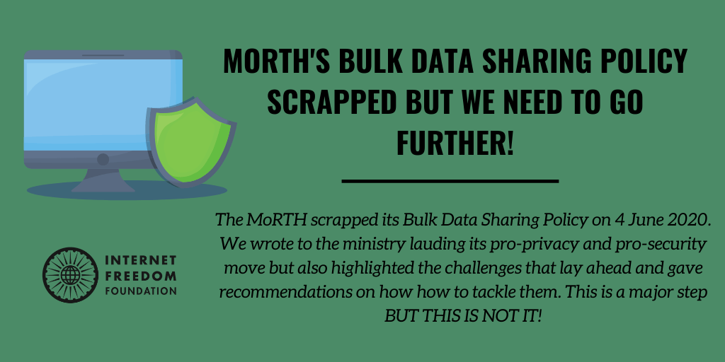- Our letter to the MoRTH dated 29 June, 2020. It thanks them for scrapping the Bulk Data Sharing Policy and further asks them to resolve the pending privacy and security issues that remain after scrapping the policy. [link]