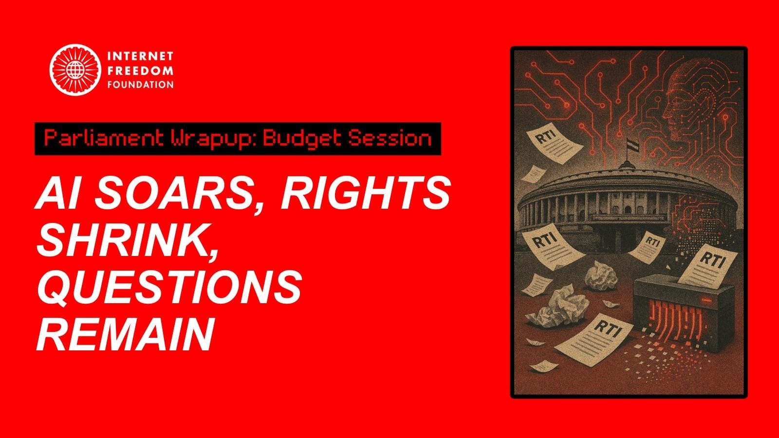 The Budget Session ended with heated protests and discussions. On the digital rights front, while this session saw increased engagement on the issues of digitalisation of PDS and AI governance, the government’s responses often revealed gaps between ambitious digital policies and their implementation. The handling of critical matters like PM Kisan and disinformation suggests a concerning trend toward reduced transparency in digital governance. Perhaps most telling is the government’s acknowledgement that no studies have been conducted on the effectiveness of internet shutdowns, despite their frequent use and significant impact on digital rights.