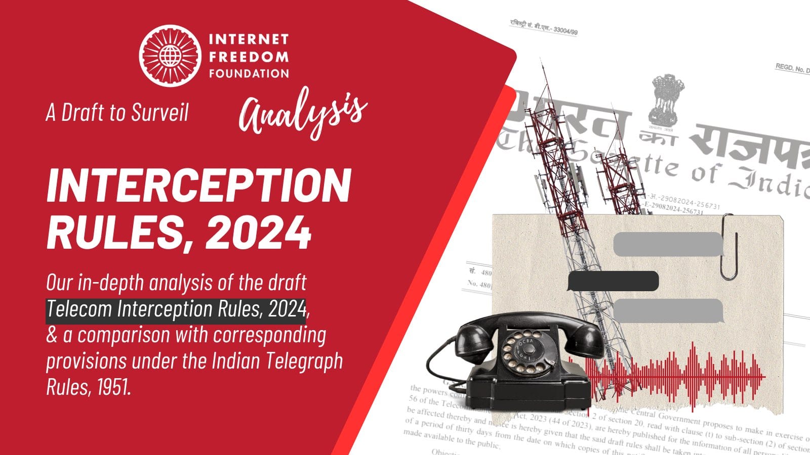 This post includes our in-depth analysis of the draft Telecom Interception Rules, 2024 and broadly India's surveillance architecture, along with a table comparing the 2024 draft Rules with the corresponding provisions under the Indian Telegraph Rules, 1951.