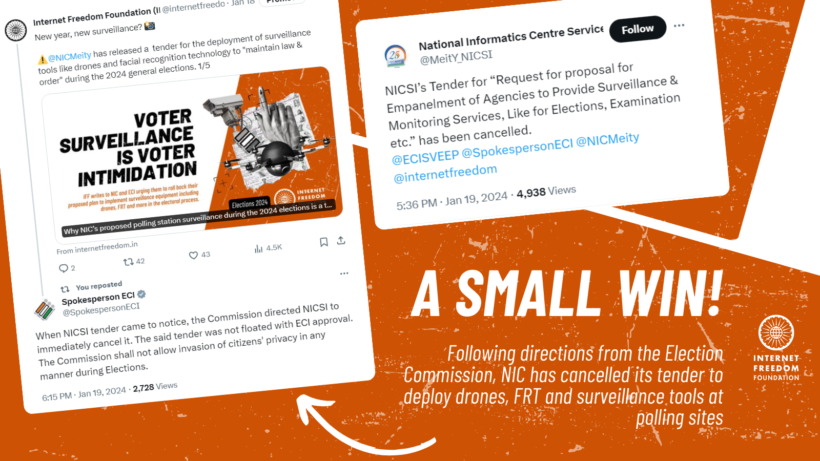 After IFF wrote to the ECI raising concerns over NIC's tender for deploying drones and facial recognition technologies at polling stations in the 2024 elections, ECI directed NIC to withdraw the tender noting risks posed by surveillance tools to voter privacy, and NIC subsequently cancelled it. A small win for voter rights!