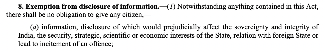S. 8(1)(a) of the RTI Act allows government ministries and departments to reject RTI applications on grounds such as national security.
