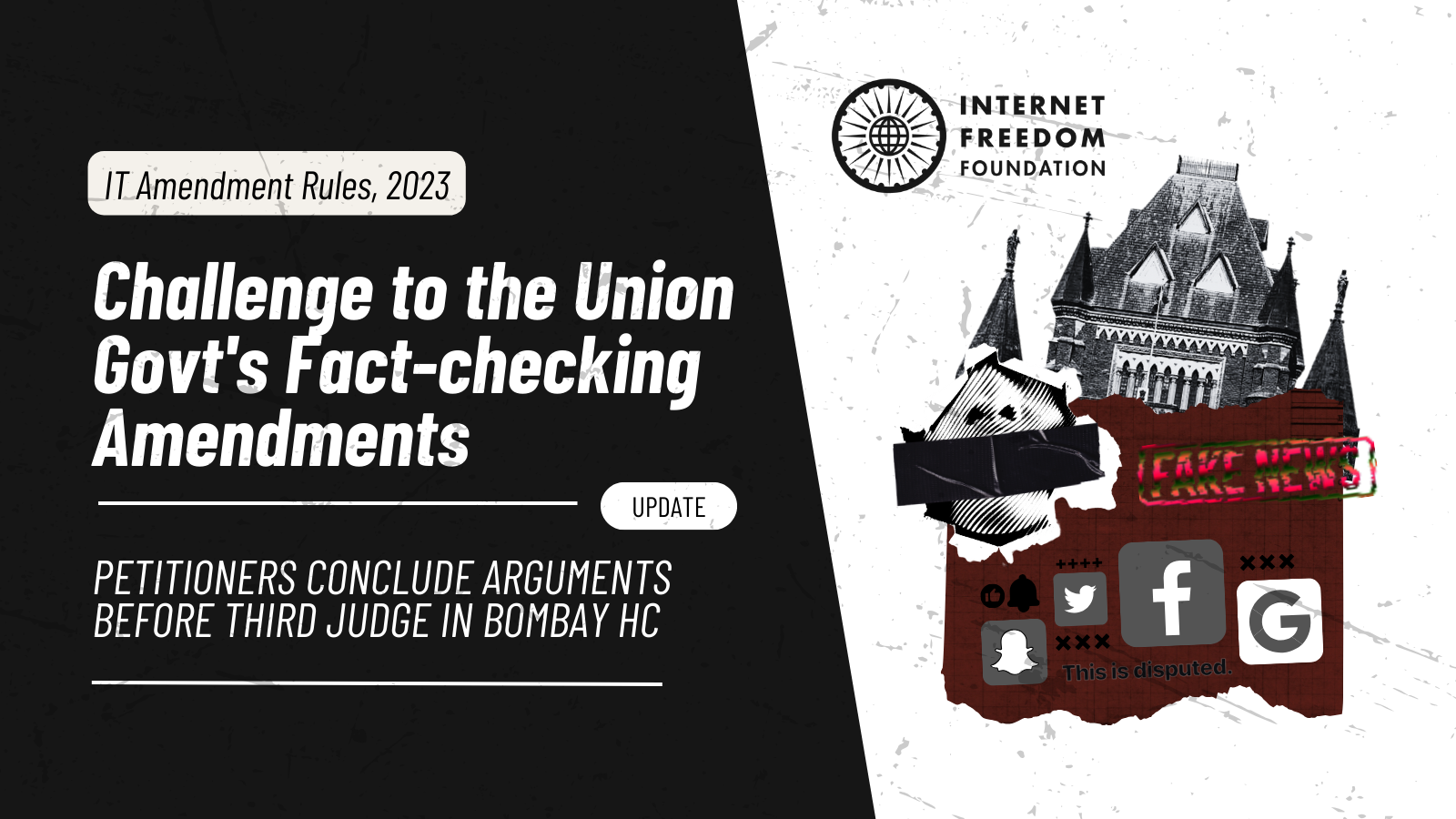 After a marathon hearing before the Bombay High Court spanning over 7 days, starting from April 15 and ending on April 24, the Petitioners have concluded their arguments before the third Judge, Justice A.S. Chandurkar, in the petitions challenging the constitutionality of the Information Technology (Intermediary Guidelines and Digital Media Ethics Code) Amendment Rules, 2023 (“IT Amendment Rules, 2023”). This amendment allows a Fact-Check Unit formed by the Central Government to detect online content deemed "fake, false, or misleading" regarding matters pertaining to the government's business, and to seek its removal from the internet. IFF is providing legal assistance to the Association of Indian Magazines (AIM), one of the Petitioners in the matter.