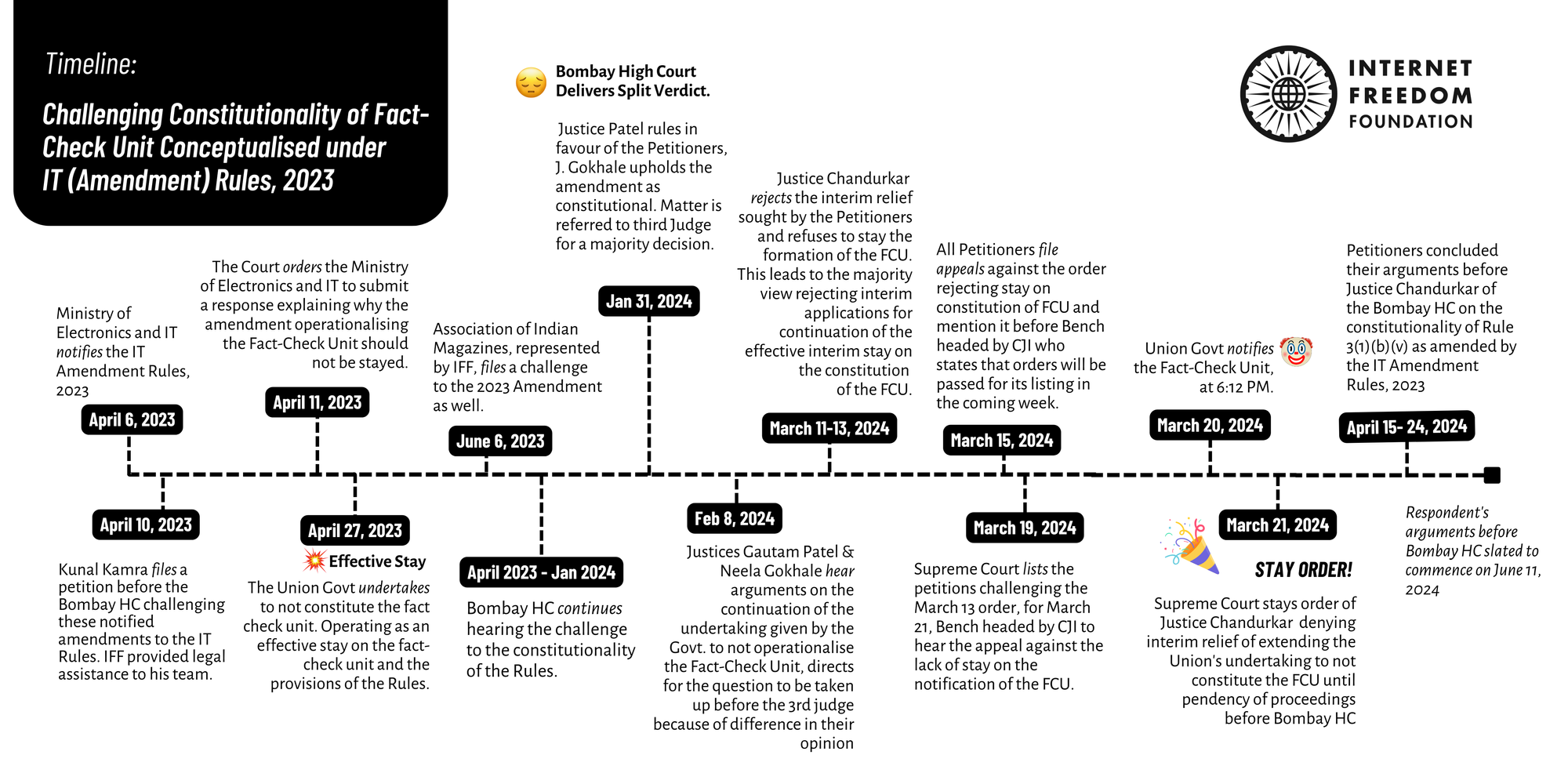 The Association of Indian Magazines, Kunal Kamra, and others filed writ petitions challenging the constitutionality of provisions relating to the FCU before the Bombay High Court. In April 2023, as a result of the petitions, the Union Government provided an undertaking not to constitute its FCU. The undertaking, having been accepted by the Division Bench of the Bombay HC, operated as an effective stay against the amendment.