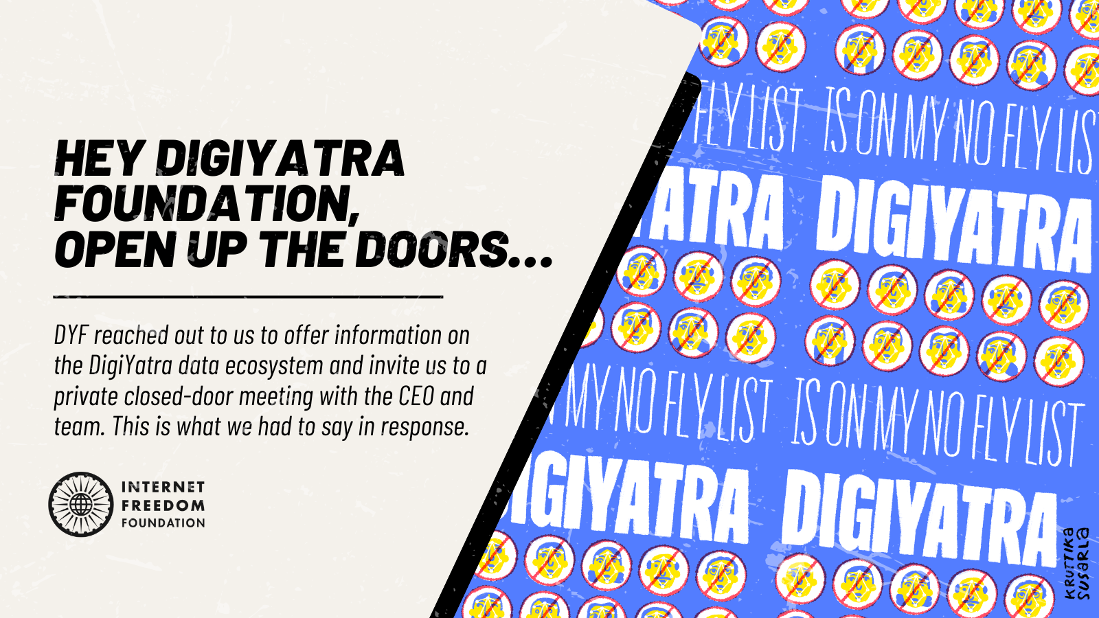 While we appreciate DYF reaching out to us, we strongly believe that this is a conversation that needs to happen in the public domain and include more diverse voices. Alongside IFF, a large number of civil society organisations, cybersecurity researchers, lawyers, privacy advocates, and passengers have been drawing attention to DigiYatra’s problematic manner of operation and privacy risks for years. They should all have the opportunity to represent their views together. Some of these organisations/individuals also possess deep knowledge about data ecosystems and infrastructures similar to Digi Yatra. Given the complexity of issues, non-transparency in design, and other concerns with DigiYatra, detailed explanations about its technical infrastructure must be in the public domain. Private, closed-door meetings would also prevent all these voices from simultaneously presenting their concerns, learning from each other's questions, and meaningfully responding to any new information shared with them.