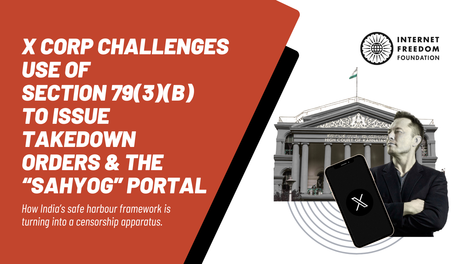 X Corp. (formerly Twitter) has challenged the Central Government’s use of Section 79(3)(b) of the Information Technology Act, 2000 (“IT Act”) to issue takedown orders before the High Court of Karnataka as a bypass of the website blocking powers under Section 69A [W.P.(C) 7405 of 2025]. It has also spotlighted an illegal censorship portal called ‘Sahyog’ which is creating a parallel procedure for blocking content on a large scale. In this post, we explain the issues with the existing process, where the safe harbour framework is being turned into a censorship apparatus.