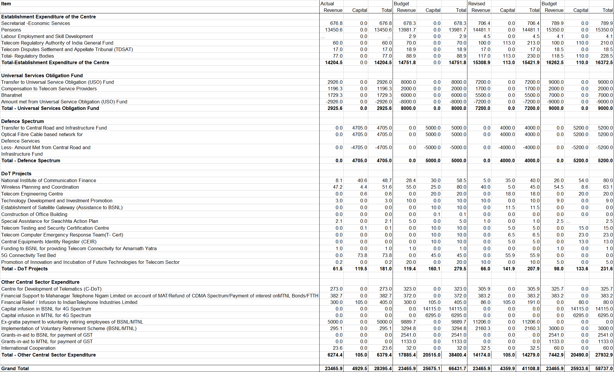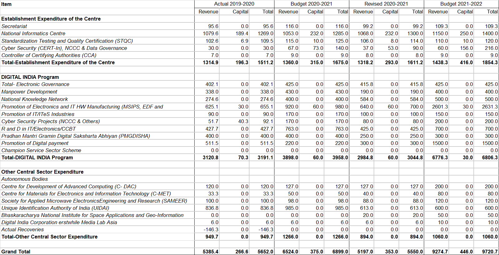 - A huge 459% increase in total capital expenditure over the Revised Estimates of 2020-21 can be observed, stemming largely from a 495% increase from the Department of Telecommunications. However, praise for these allotments must be tinged with hint of caution, as the Revised Estimates of 2020-21 for capital expenditure in the Department were only 17% of the Budget Estimates of 2020-21. While it is possible that the lower spending is due to the COVID-19 pandemic, the actual spend on capital expenditure in 2019-20 was also at similarly low levels (Rs. 4,929.5 crore) .