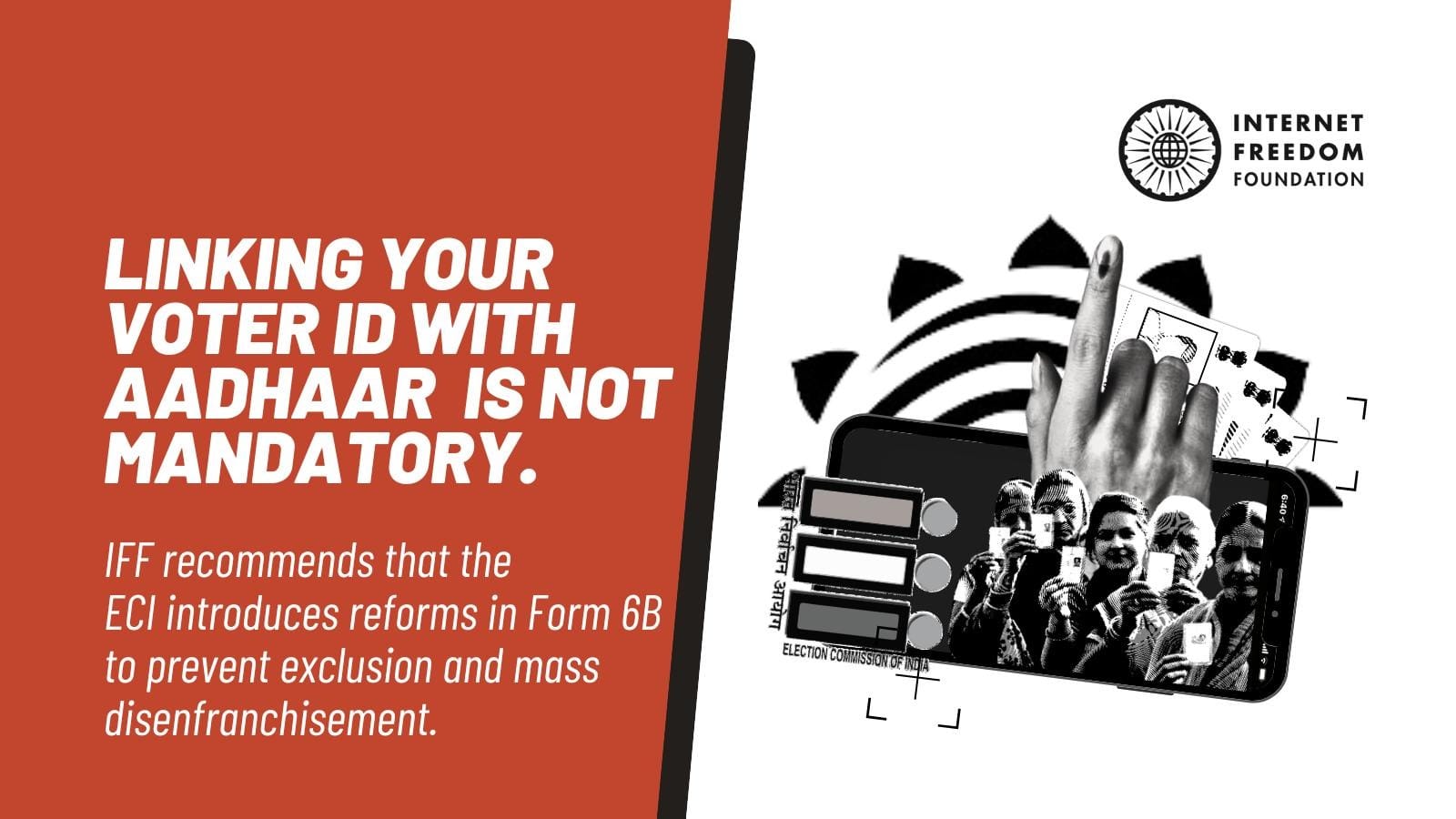 This issue is further underscored by the June 17, 2022 notification from the Ministry of Law and Justice which states that individuals "may intimate" their Aadhaar number, yet Form 6B provides no meaningful opt-out mechanism, creating administrative pressure that effectively transforms this “voluntary” process into a de facto mandatory requirement. Furthermore, the ECI must provide clear and specific information to eliminate any ambiguity regarding the voluntary nature of sharing Aadhaar information, as its press statement on March 18, 2025, did not explicitly clarify this. Read our previously published explainer on how to protect yourself from the coercive linking of Aadhaar with your Voter ID.