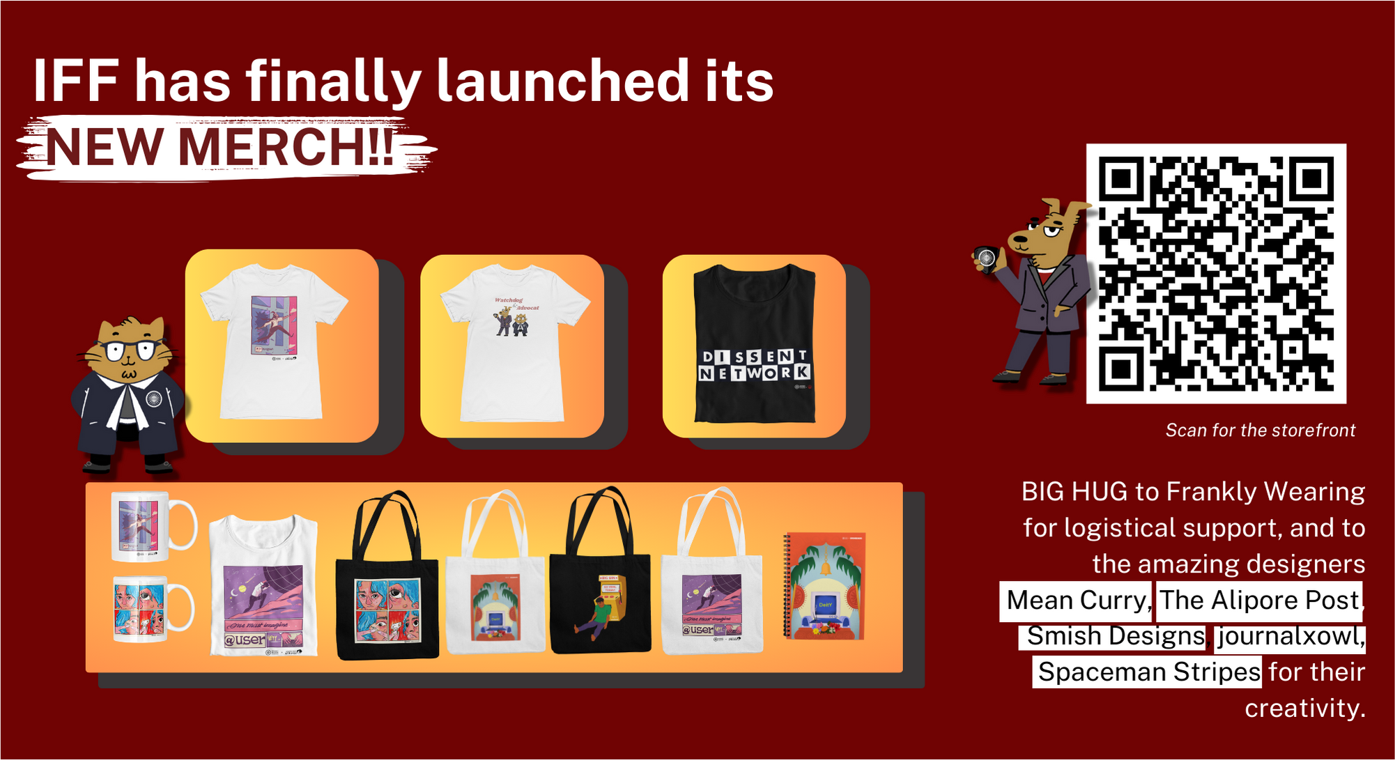 We thank the artists, The Alipor Post, journal x owl, Smish Designs, Mean Curry, & Spaceman Stripes for pouring their hearts into designing such stunning illustrations for IFF merch! We also thank Frankly Wearing for hosting our merch at their storefront. Stand up for digital rights in cute gear! Explore these adorable merch options on Frankly Wearing's website and join us in supporting our mission!