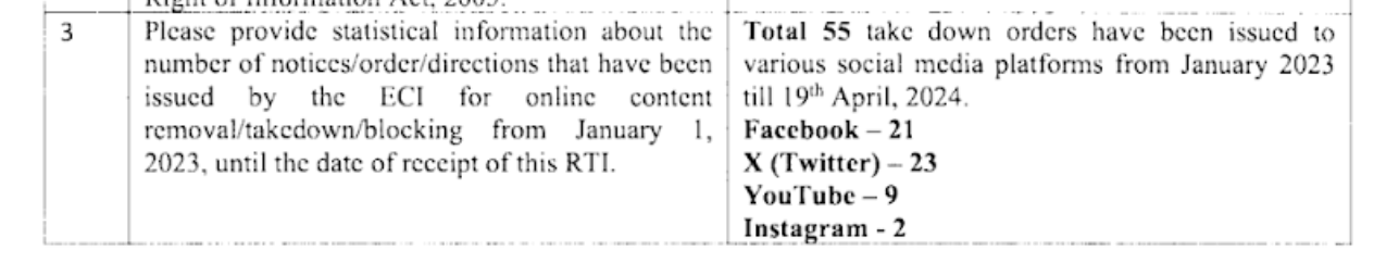 10. On April 16, 2024, X posted about four takedown orders issued by ECI against four tweets. Subsequently, we filed seven separate RTIs with the ECI, seeking statistical information on takedown orders for six social media platforms. Additionally, we submitted a generic RTI requesting information on orders issued to all social media platforms from January 1, 2023, until the RTI was received (i.e. April 19, 2024). We also sought copies of the orders, information on the relevant laws granting the ECI the power to issue takedown orders, criteria for determining objectionable content, consequences of non-compliance, and other relevant details. Following is a list of RTIs we filed: