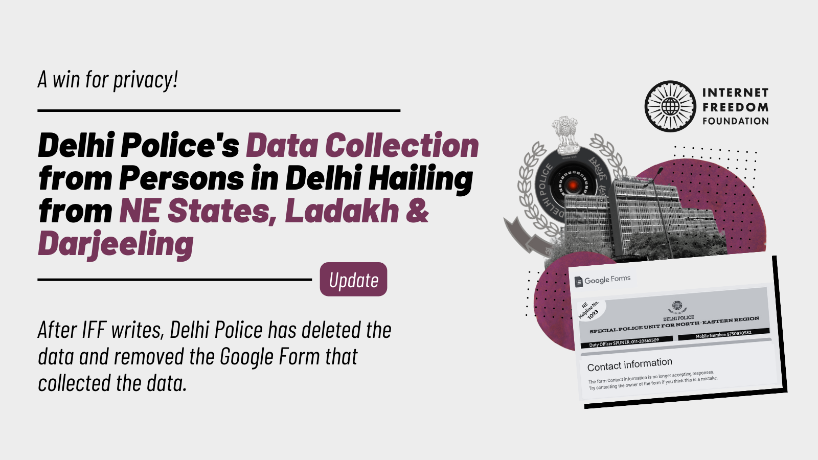 In August, we found out, from news reports, that the Special Police Unit for North-Eastern Region (“SPUNER”), which operates under the Delhi Police, initiated a data collection exercise, which involves collecting personal data from residents in Delhi hailing from the Northeastern states, Darjeeling and Ladakh through a Google Form. On August 14, 2023, we wrote to the Delhi Police Commissioner raising concerns about this measure.