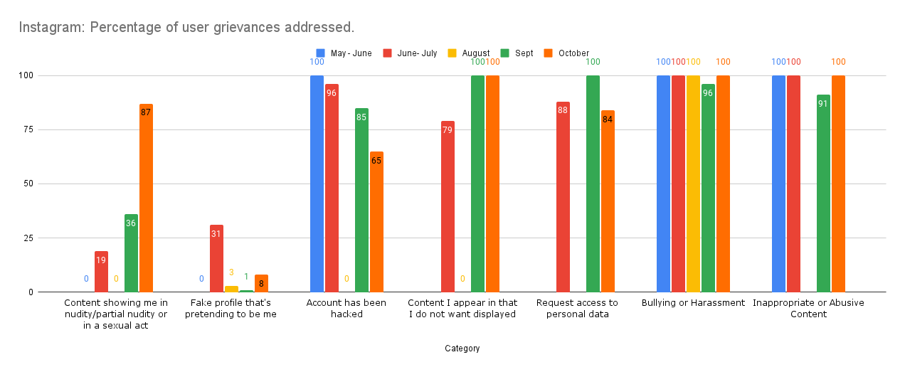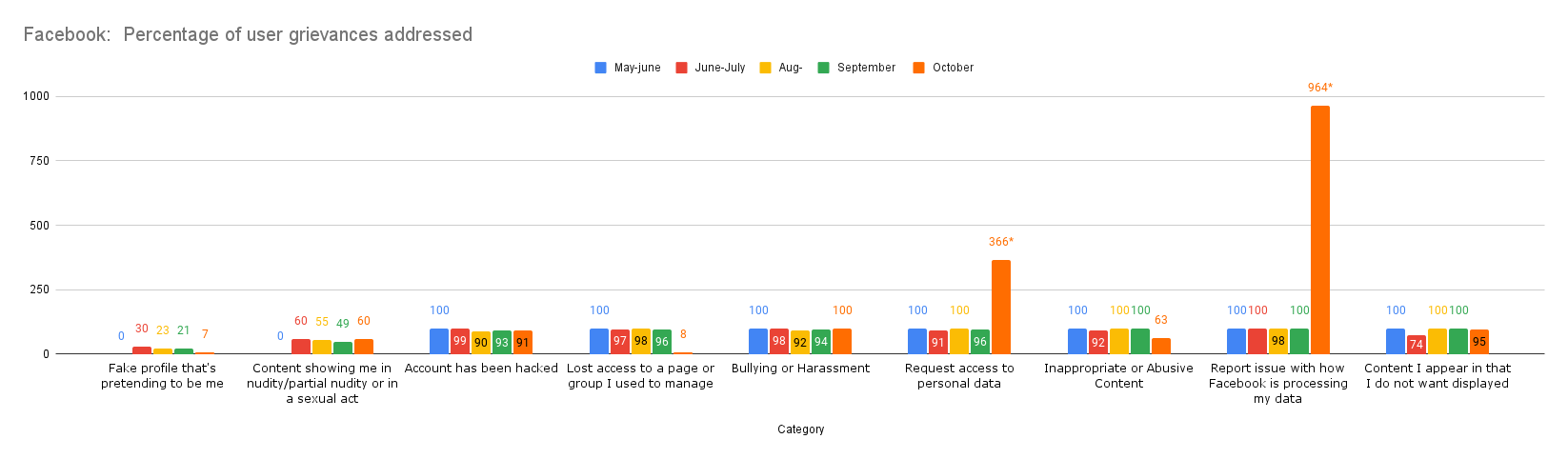 Despite disclosures made by Frances Haugen, Facebook and Instagram have not changed the metrics adopted for reporting proactive takedowns. According to its reports, Facebook and Instagram adopt the metrics of (i) ‘content actioned’ which measures the number of pieces of content (such as posts, photos, videos or comments) that they take action on for going against their standards and guidelines; and (ii) proactive rate which refers to the percentage of ‘content actioned’ that they detected proactively before any user reported the same. This metric is misleading because the proactive rate only gives a percentage of that content on which action was taken, and excludes all content on Facebook (which may otherwise be an area of concern) on which action was not taken. We have written more about this in our previous post.