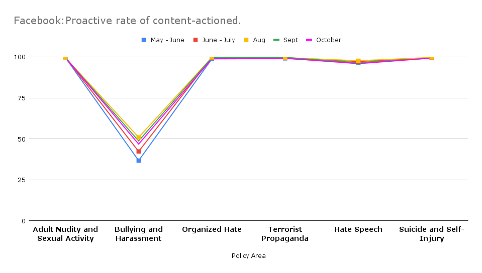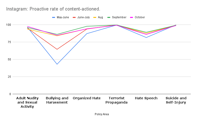 Relatedly, the proactive rate for actioning content for reasons of hate speech has reduced significantly to 86.1% from 96.5%, 97.7%, 97.2%, and 96.4% in the previous months.