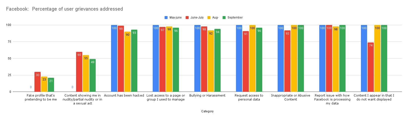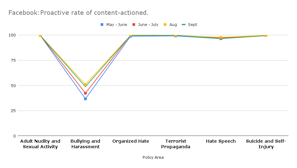 Be that as may, as per the metrics provided, the proactive rate for actioning of content for bullying and harassment still stands at the lowest at 48.7% which has fallen from last month’s 50.9%. This figure is particularly low as compared to 8 other issues (including hate speech and violent content) where the rate is more than 96%. This means that maximum user complaints were received under this category, and that Facebook is consistently failing to curb the menace of bullying and harassment.