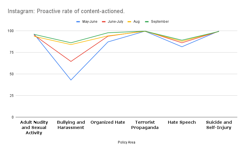 As per its reports (which now has a Meta logo instead!), Facebook and Instagram adopt the metrics of (i) ‘content actioned’ which measures the number of pieces of content (such as posts, photos, videos or comments) that they take action on for going against their standards and guidelines, (ii) proactive rate which refers to the percentage of ‘content actioned’ that they detected proactively before any user reported for the same. This metric is problematic because the proactive rate only gives a percentage of that content on which action was taken, and excludes all content on Facebook (which may otherwise be an area of concern) on which action was not taken. This problem in the metric becomes a glaring concern in light of the documents leaked by Frances Haugen which show that Facebook has boasted of proactive removal of over 90% of identified hate speech in its “transparency reports” when internal records showed that “as little as 3-5% of hate” speech was actually removed. These documents confirm what civil society organizations have been asserting for years, that Facebook has been fueling hate speech around the world because of its failure to moderate content and its use of algorithms to amplify inflammatory content.