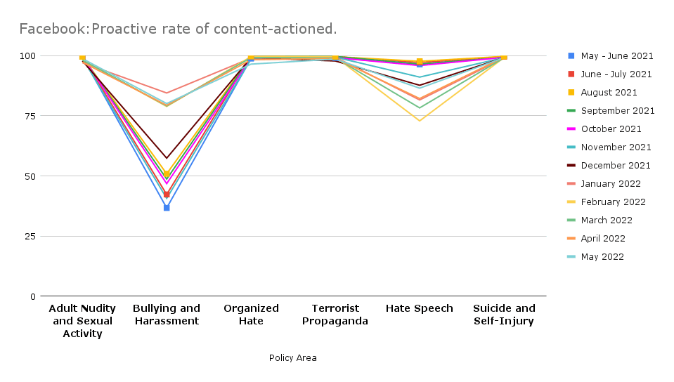 Meta (Facebook and Instagram) has not changed the metrics adopted for reporting proactive takedowns, despite disclosures made by Frances Haugen. In its report, Meta adopts the metrics of (i) ‘content actioned’ which measures the number of pieces of content (such as posts, photos, videos or comments) that they take action on for going against their standards and guidelines; and (ii) proactive rate which refers to the percentage of ‘content actioned’ that they detected proactively before any user reported the same. This metric is misleading because the proactive rate is measured as a percentage of only that content on which action was taken (either proactively or on the basis of user complaint). It does not show what percentage of all content on Facebook (which may otherwise be an area of concern but not flagged by users) was proactively taken down. Such a metric neither reflects the efficiency of the proactive takedown mechanism nor discloses the process followed for undertaking automated takedowns. We have written more about this in our previous post.