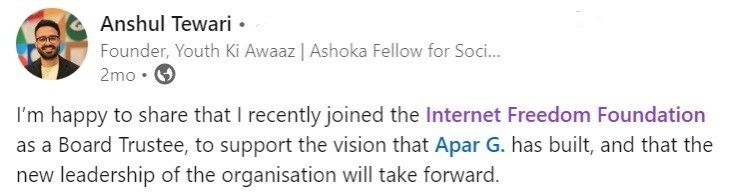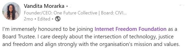 With deep gratitude and respect for all the efforts and support provided to IFF, the Board announces that Ms. Rachita Taneja and Mr. Aravind Ravi-Sulekha will be stepping down as Trustees of the Board after serving a term of seven years. IFF acknowledges their invaluable contribution from day zero. They have served the cause of digital rights with courage and diligence. We thank them for their continued dedication and shared passion for digital and privacy rights and will continue working with them in a voluntary capacity.