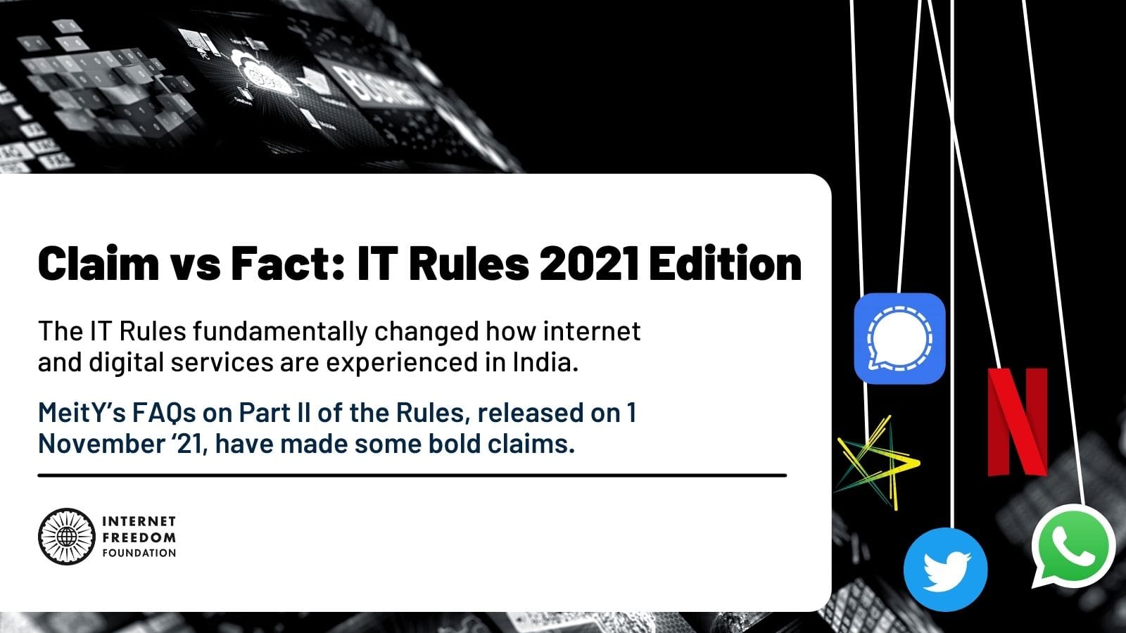 'The Union Government had notified the Information Technology (Intermediary Guidelines and Digital Media Ethics Code) Rules, 2021 in February, 2021 (‘the Rules’). Back then, we provided a deep-dive of the Rules and thereafter, they have been subject to several challenges. The High Court of Madras and Bombay have stayed Part III of the Rules. Now almost 8 months after the notification of the Rules, the Ministry of Electronics and Information Technology has released a document consisting of Frequently Asked Questions purportedly to ‘bring clarity’ and to ‘explain the nuances of the due diligence to be followed by intermediaries’. In this blogpost, we separate the Facts from the Claims made in the FAQ document.