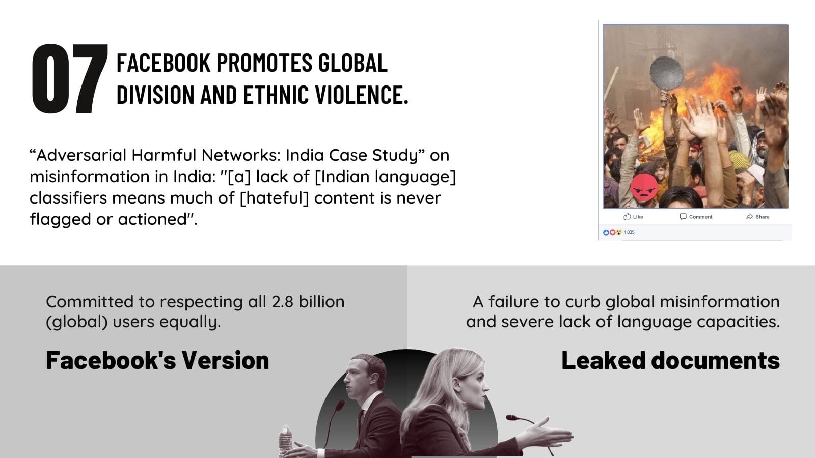According to claims made by Facebook, it has 2.8 billion users around the world, and that it is committed to international issues. However, Haugen submitted original evidence on how Facebook is failing to curb global misinformation and ethnic violence due to inadequate language capabilities. Currently, Facebook is available in more than 100 different languages with offices or data centers in more than 30 different countries. According to a statement made by Facebook in May 2021 to the US Committee on Energy and Commerce, they work with over 80 independent third party fact-checkers around the world covering more than 60 languages to combat misinformation in these languages. However, according to original evidence submitted by Haugen to the SEC this is inadequate to satisfactorily respond to misinformation and violence inciting statements in regional languages and dialects.