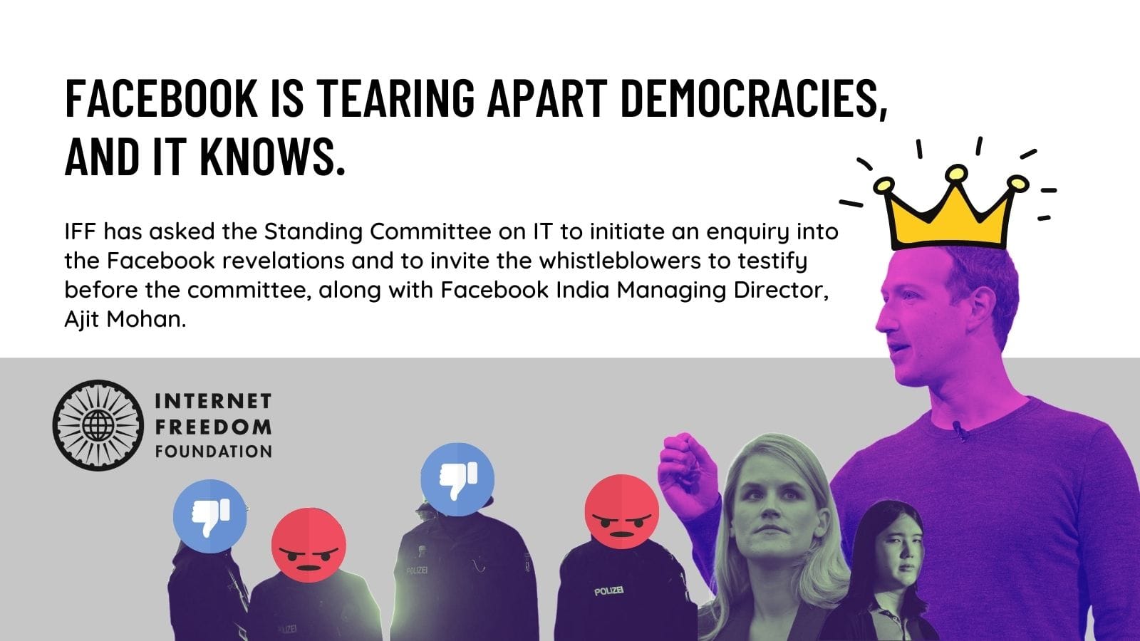 Two whistleblowers have revealed that Facebook is well aware of the real world harms it causes to its users and to democratic ideals worldwide, but it chooses to prioritise profit over doing the right thing. We wrote to the Parliamentary Standing Committee on Information Technology asking them to initiate an inquiry into the revelations made, specifically about India and to call the relevant stakeholders to testify before it.