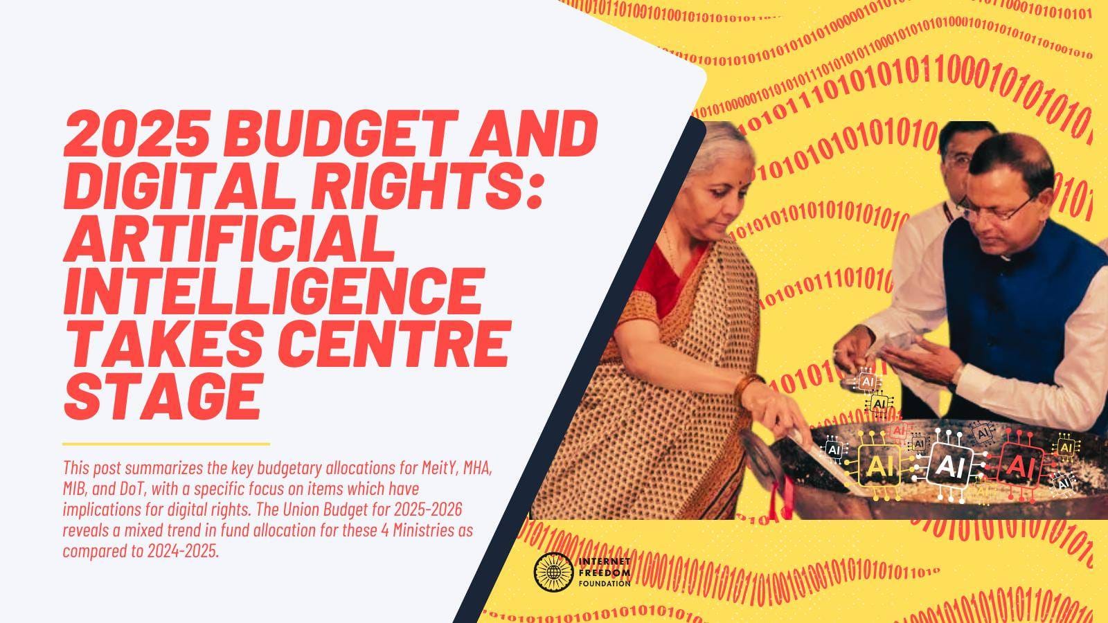 The Union Budget for 2025-26 reflects a significant decline in overall allocations for Department of Telecommunications and Ministry of Home Affairs as compared to 2024-25 and meagre increment to the Ministry of Information and Broadcasting while Ministry of Electronics and Technology saw 18.64% increased allocations partly due to the prioritization of India AI mission. Even as the Central Sector Schemes under Department of Telecommunications seeing a massive increase in allocation for USOF and Bharatnet by 900% and 158.82% respectively as compared to last year, analysis reveals a sizeable reduction in the Other Central Sector Expenditure under Department of Telecommunications and issues of underutilisation within Ministry of Electronics and Technology being a cause for concern.