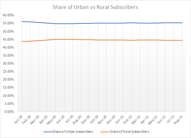Rural areas have also witnessed increasing connectivity: rural telephone subscribers have grown by 2.52% between August 2020 and August 2021 to 538.28 million, while rural tele-density increased by 1.21% to 60.27%. However, the shares of urban (~55%) and rural (~45%) subscribers in total subscriptions have remained stagnant.