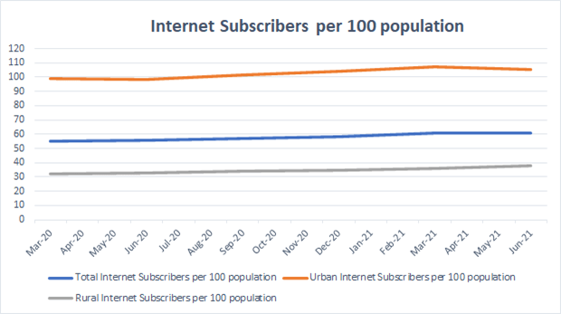 Internet penetration in rural areas also continues to grow as rural internet subscribers have increased by 50.9 (17.7 %) million since March 2020, and stand at 336.87 million as of June 2021. However, rural internet penetration is still at 37.74%, approximately a third of urban internet penetration at 105.66%, despite urban internet penetration dropping slightly in the April-June 2021 quarter.