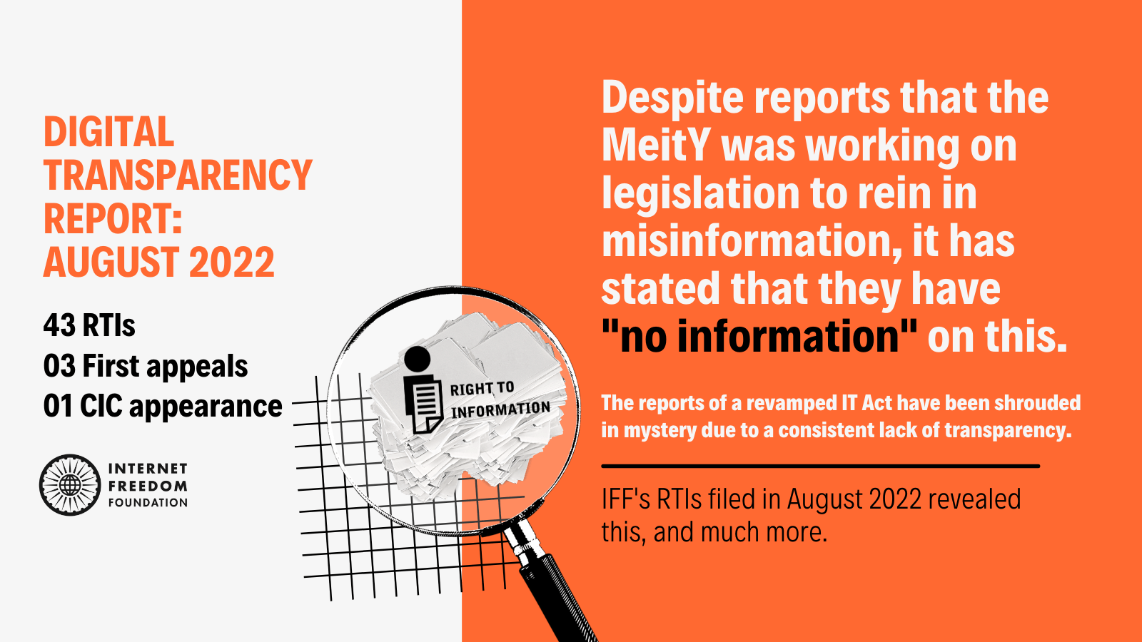 For the month of August 2022, IFF has filed 45 Right to Information (“RTI”) applications, 3 first appeals and appeared in 1 second appeal before the Central Information Commission.