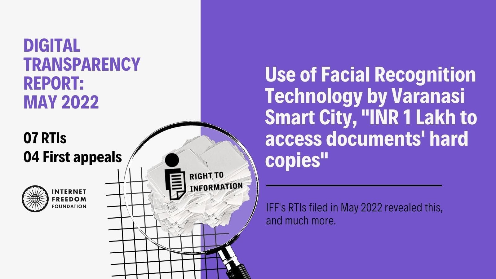 For the month of May 2022, IFF has filed 7 Right to Information (“RTI”) applications and 4 first appeals.