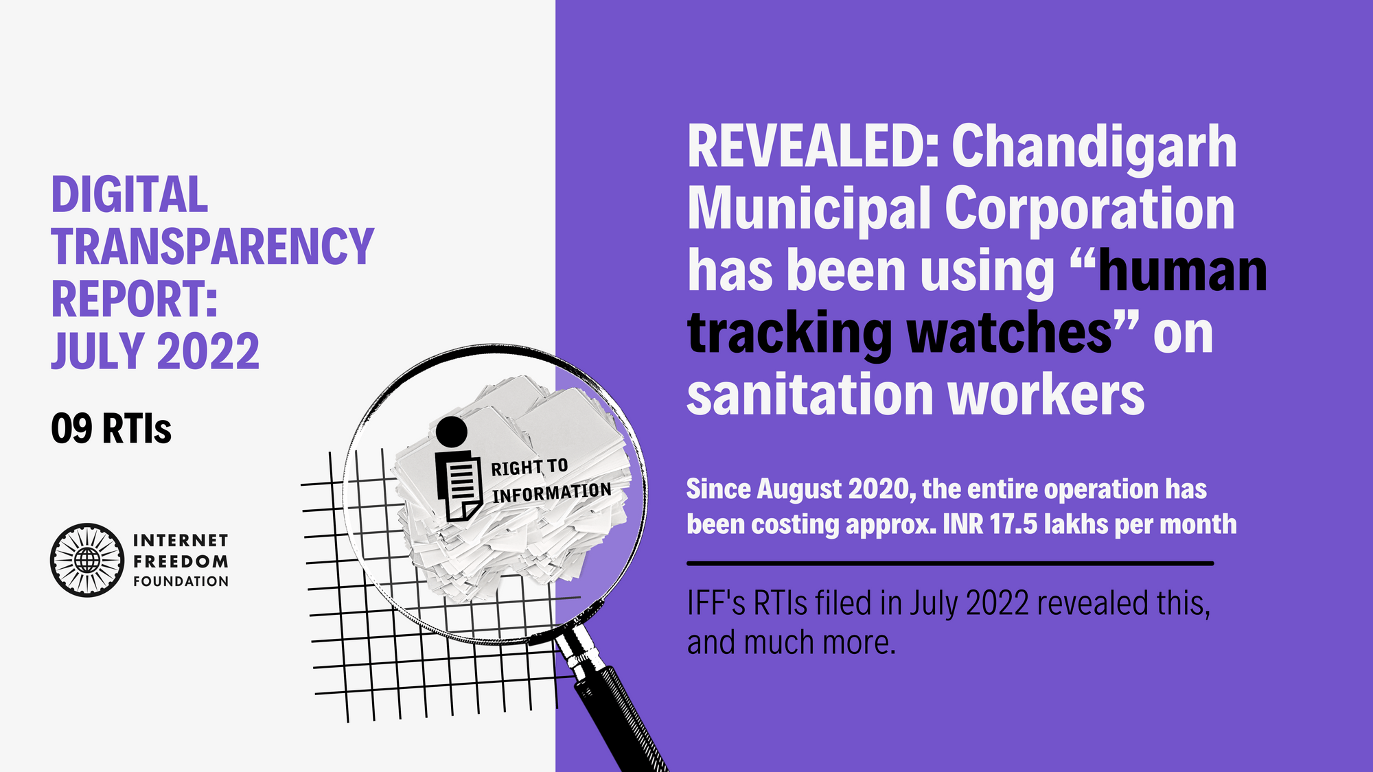 For the month of July 2022, IFF has filed 9 Right to Information (“RTI”) applications. In response to an RTI application on surveillance of sanitation workers in Chandigarh, the Chandigarh Municipal Corporation has shared that they have been using “human tracking watches” on field staff since August 1, 2020 and incur approximately Rs 17.5 lakhs per month on it.