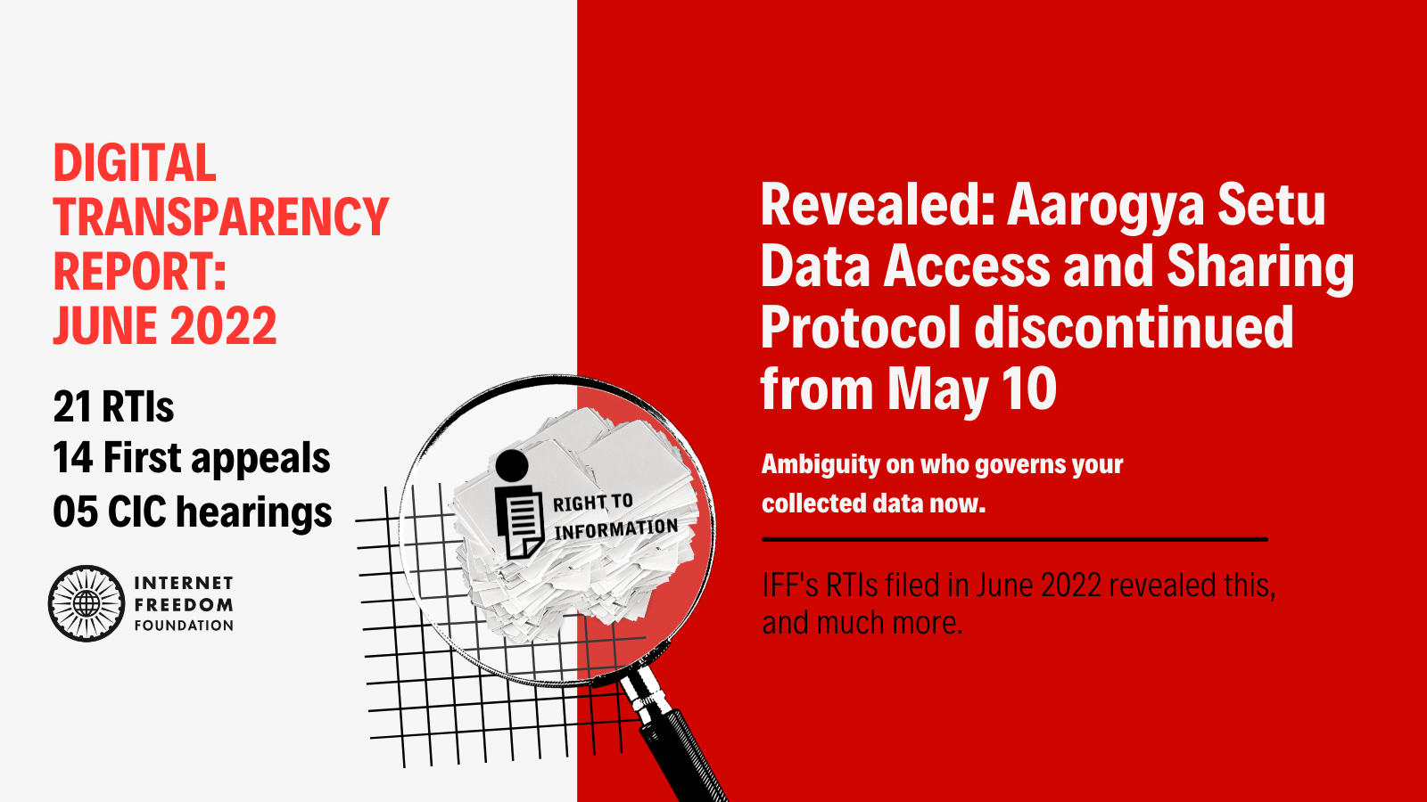 For the month of June 2022, IFF has filed 21 Right to Information (“RTI”) applications and 14 first appeals. In a response to the RTI application on the current status of the Aarogya Setu Data Access and Sharing Protocol, 2020, the Ministry of Electronics and Information Technology (‘MeitY’) responded that it had been discontinued since May 10, 2022. It also stated that the Empowered Group on Technology and Data Management - which notified the protocol in May 2020 was dissolved in September 2020.