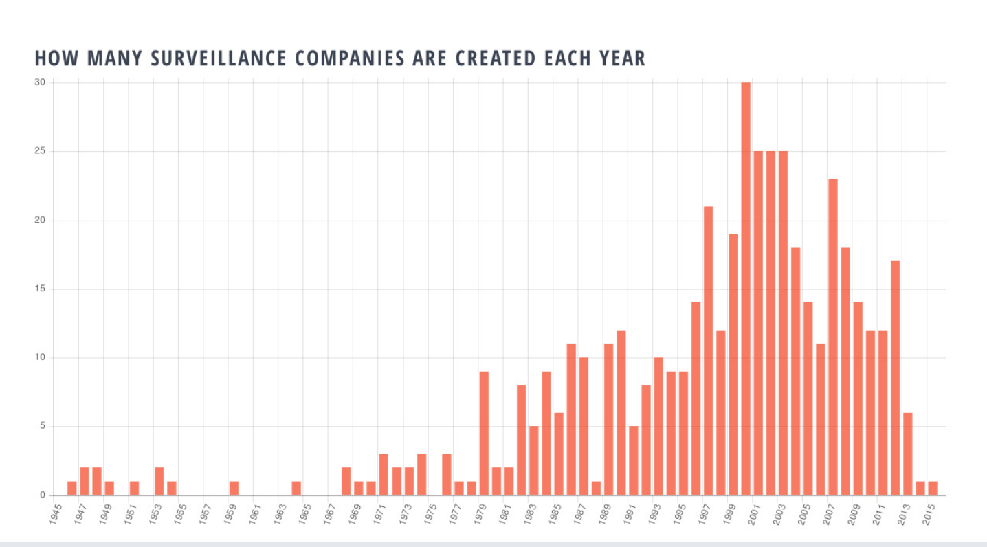 For example, this graph looks at the number of surveillance companies created each year from 1945 to 2015.