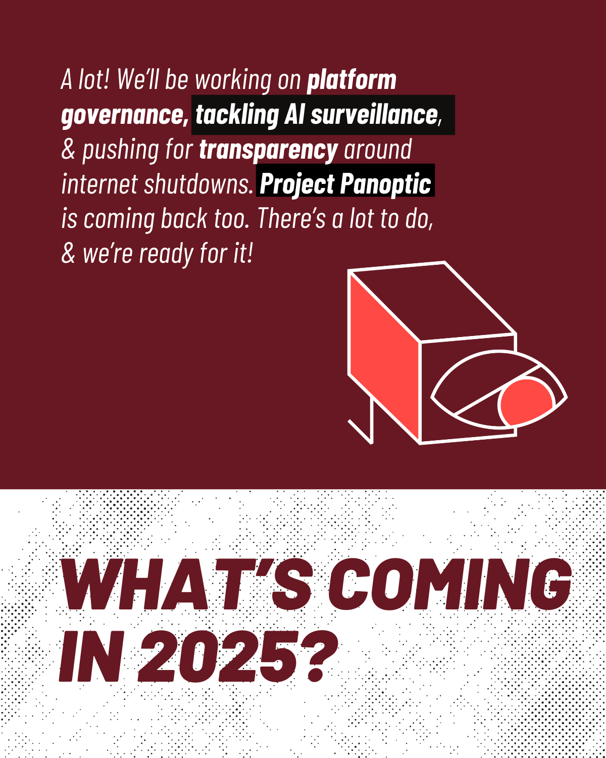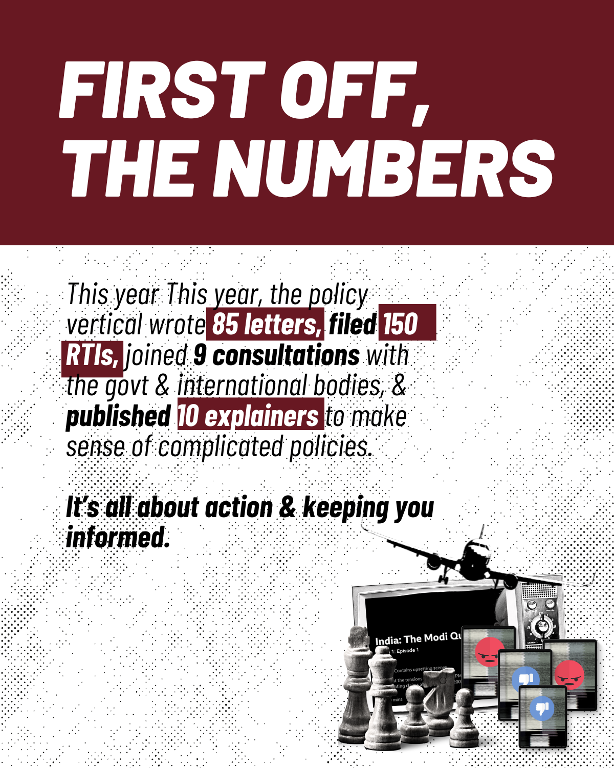 Building on our momentum this year, we are committed to intensifying our efforts in 2025. We will closely track parliamentary proceedings, with a focus on the use of AI in surveillance and platformisation. Our research will fill gaps in areas where literature is lacking, such as internet shutdowns and Fact Check Units, by publishing reports on these topics. We will also expand our engagement with legislators and government bodies to deepen our involvement at both the Union and State levels. Additionally, we are committed to simplifying complex technological policies, such as AI and Digital Public Infrastructure, to make them more accessible. With renewed energy and hope, we will also revive halted projects such as Project Panoptic and continue advancing digital rights in the year ahead.