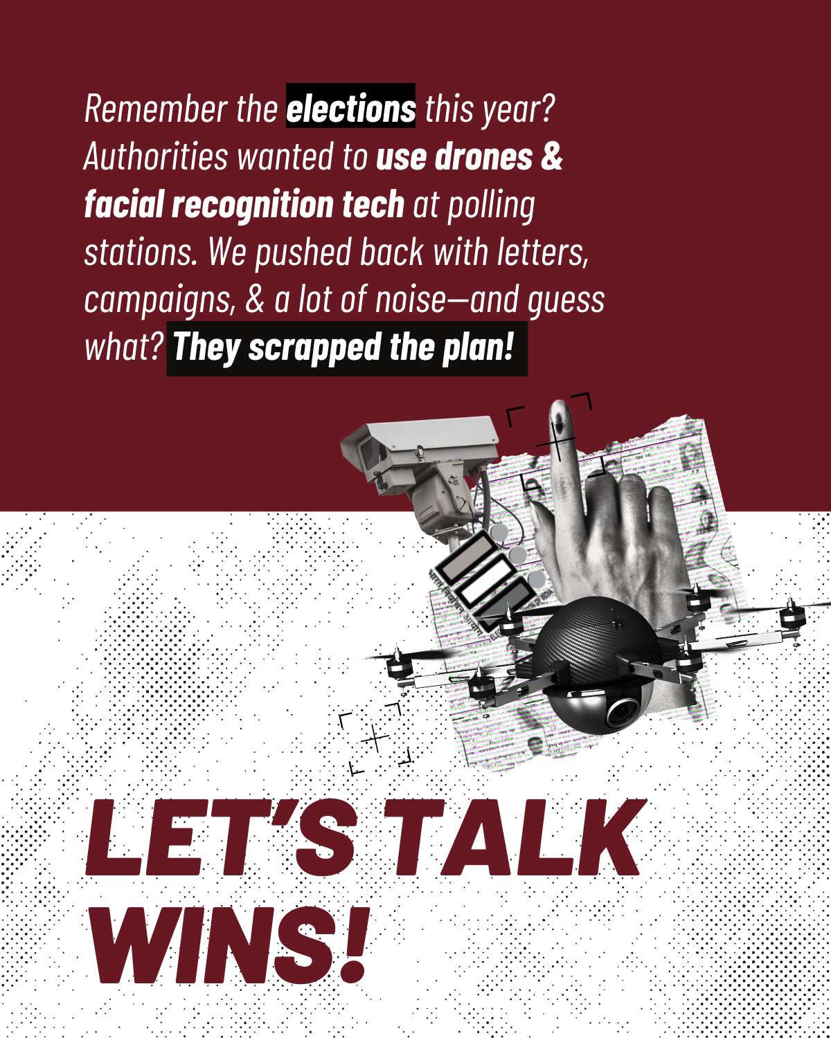 IFF successfully stopped the deployment of drones and facial recognition technologies in the 2024 elections. In December 2023, the National Informatics Centre (“NIC”) issued a tender to acquire surveillance equipment, including drones and facial recognition systems, for monitoring the Union and State elections. Reportedly, the plan involved live webcasting, voting and counting processes, setting up a centralized command center, and deploying field surveillance vehicles and facial recognition for voter verification. This plan raised serious privacy concerns, including risks of voter intimidation and exclusion errors. On January 17, we wrote to the Election Commission of India (ECI) and NIC to withdraw the tender. The next day, we published a summary of our letter on social media, including a Twitter thread, calling for the tender's cancellation. Just two days later, the ECI spokesperson confirmed in a response to our thread that the ECI had directed the NIC to cancel the tender. Following which, the NIC Service Centre posted that it has formally cancelled the tender.