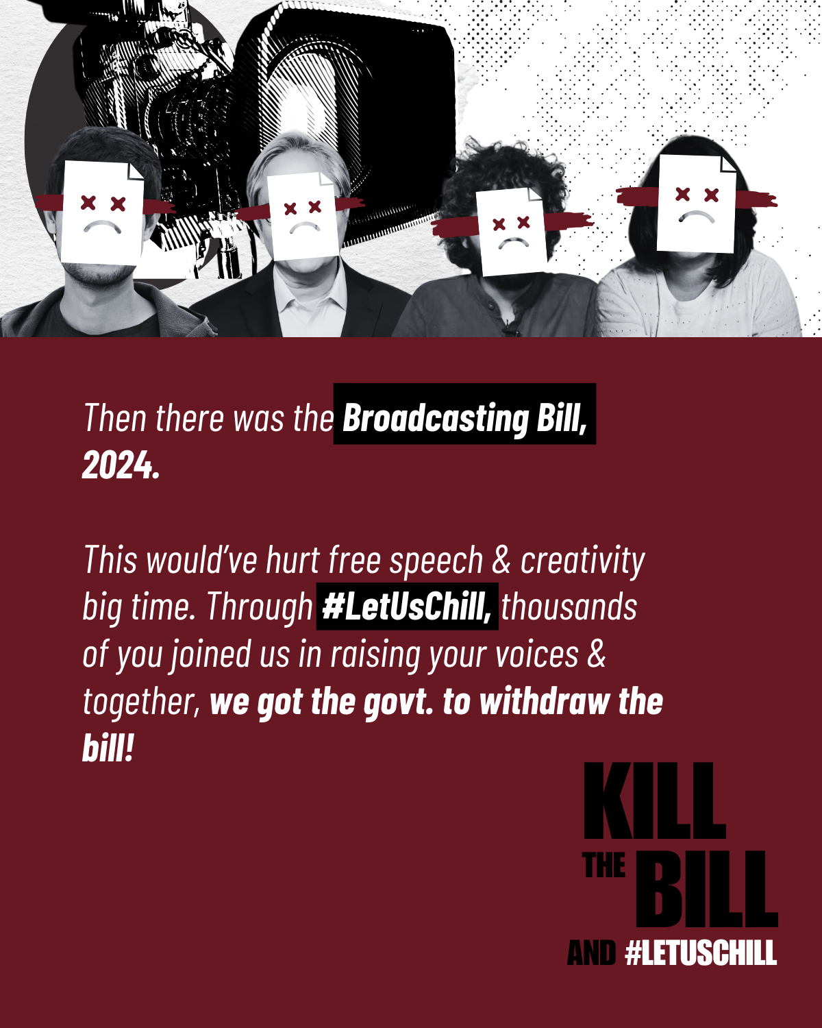We successfully pushed the Ministry of Information and Broadcasting (MIB) to withdraw the Broadcasting Bill, 2024. After consultations on the 2023 Bill, MIB reportedly circulated a watermarked draft of the 2024 Bill, which could impose compliance obligations on digital creators and negatively impact free speech. In response, we launched the #LetUsChill campaign, by mobilizing thousands to demand the Bill be scrapped. On August 1, 2024, we also collaborated with digital creators and organized a social media storm with #KillTheBill and #ContentBachao hashtags. We also urged Members of Parliament to oppose the Bill, providing them with a comprehensive explainer on its threats to Constitutional free speech. To highlight the Bill’s impact, we published a cheat sheet on its penalties for creators. Amid mounting pressure, the MIB reportedly asked stakeholders to return physical copies of the 2024 Bill for reconsideration. On August 12, 2024, the MIB announced that the Bill would be “withdrawn” and a new draft would be released following further consultations, extending the deadline for comments on the 2023 Bill to October 15, 2024.