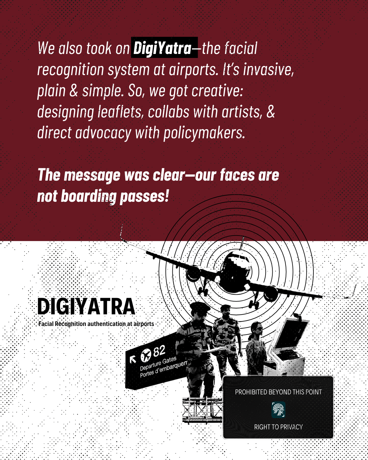 Many passengers have raised their concerns about the forced and worrisome implementation of DigiYatra at various airports and reached out to us for support. In response to these concerns and to make the key stakeholders accountable, we reached out to Ministry of Civil Aviation , NITI Aayog, Airports Authority of India, Digi Yatra Foundation, and the Delhi, Bengaluru, Mumbai, Cochin and Hyderabad airports urging them to completely withdraw DigiYatra from Indian airports owing to its large gamut of concerns relating to privacy, surveillance, exclusion errors and lack of institutional accountability and transparency. In collaboration with several artists like Kruttika Susarla and Sanitary Panels, IFF released an all-you-should-know leaflet and a line of merchandise (tees, totes and more!) with a call to #RejectDigiYatra.