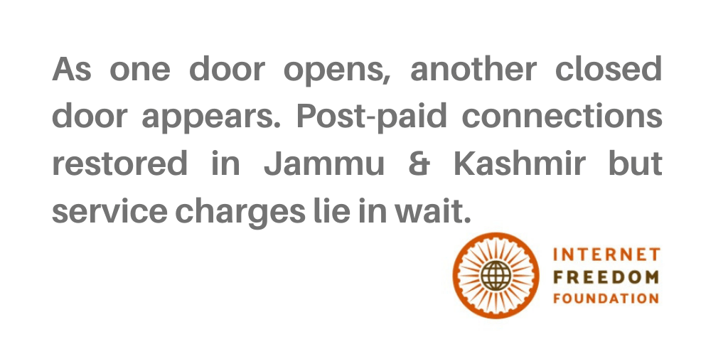 As per a press report in the Quint, the communication shutdowns in Kashmir was partially lifted providing postpaid users access to voice calls. However, while having regained access to voice calling facilities are required to clear payments for services over the last two months in order to make use of their services. We write to the DOT explaining why these charges must be waived.