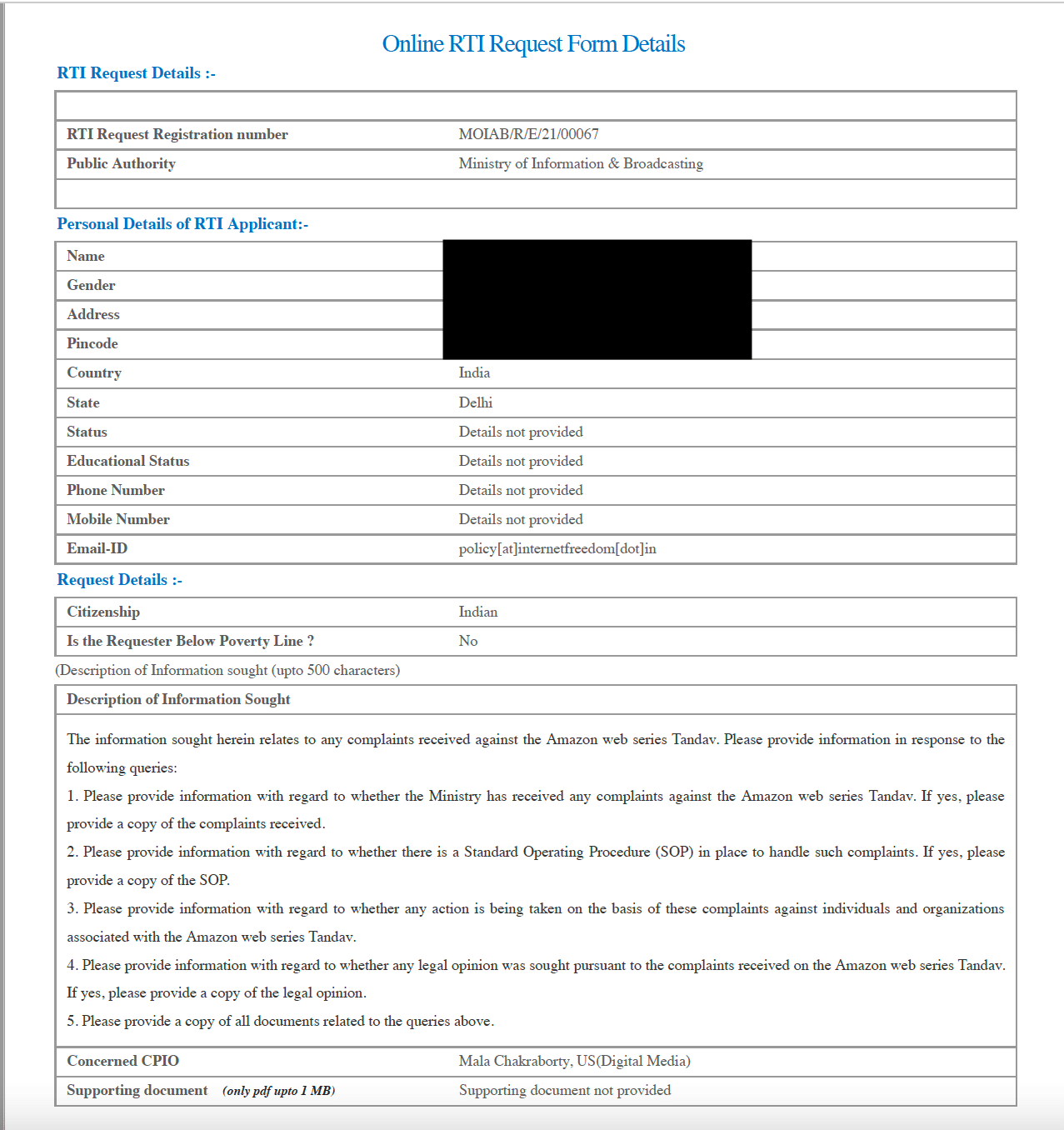 We use the RTI Act, 2005 as a tool for demanding transparency and accountability from public authorities on issues of public importance. The Tandav controversy and the resulting conversation around censorship of OTT content is one such issue which we feel is of public importance.  Therefore, on February 8, 2021, we filed a RTI request with the Ministry of Information and Broadcasting asking them to share with us the complaints they received against the series. The issue also gained importance subsequently because it essentially spurred the regulation of OTT platforms through the Intermediaries Rules, 2021.