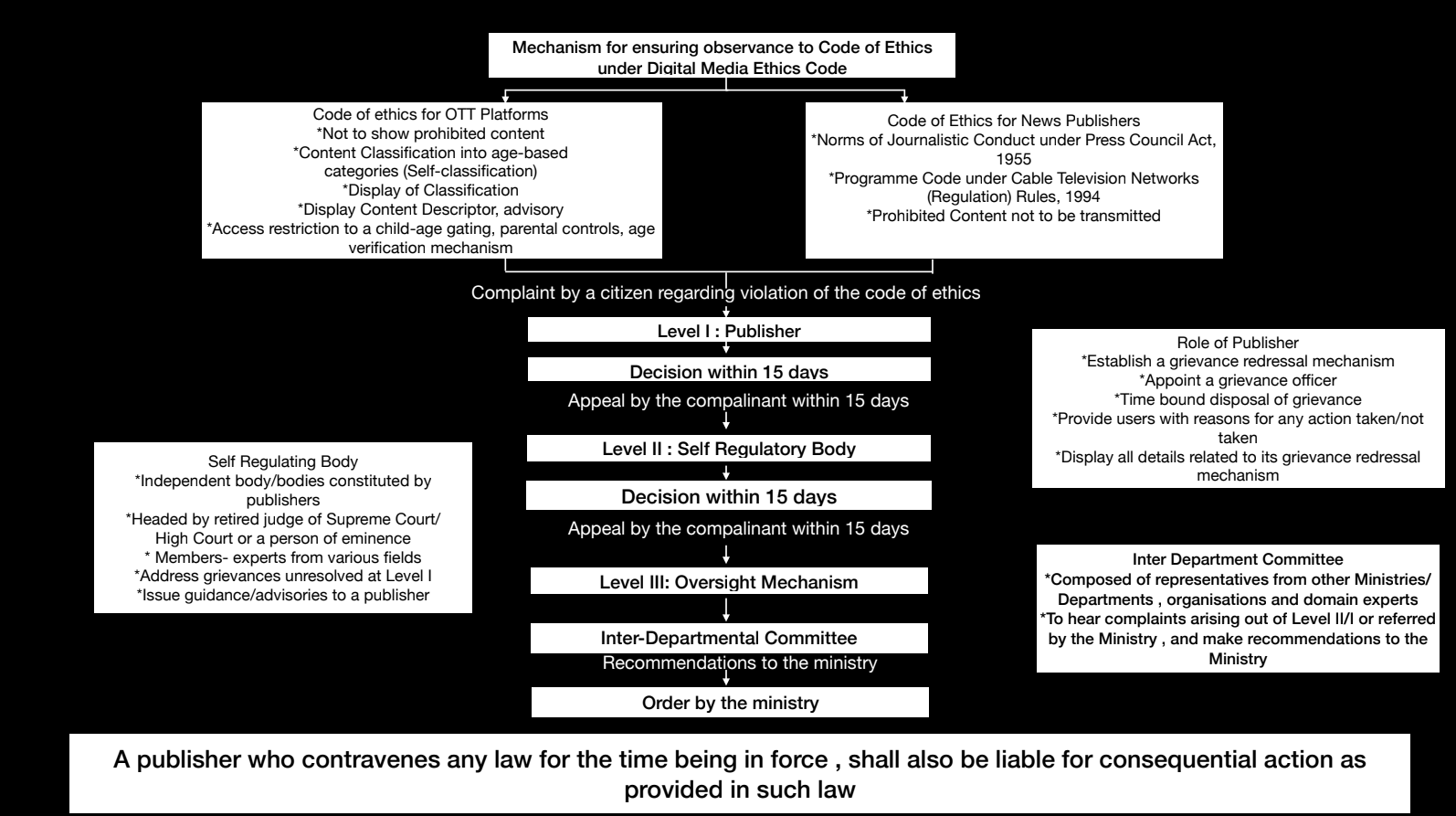 The Grievance Officer mentioned above is only tier-1 of a 3-tier system. If the response of the Grievance Officer is not considered satisfactory by the complainant, they may appeal to the second tier. The second tier is a self-regulatory body with up to 6 members who are experts in the fields of media, broadcasting, entertainment, child rights, human rights, etc. However, while this is framed as the second layer of self-regulation, this is actually the first layer of government oversight, since the composition of this body is ultimately subject to the approval of the Ministry of Information & Broadcasting. Hence, the complainant can continue escalating the complaint till they achieve the desired result.