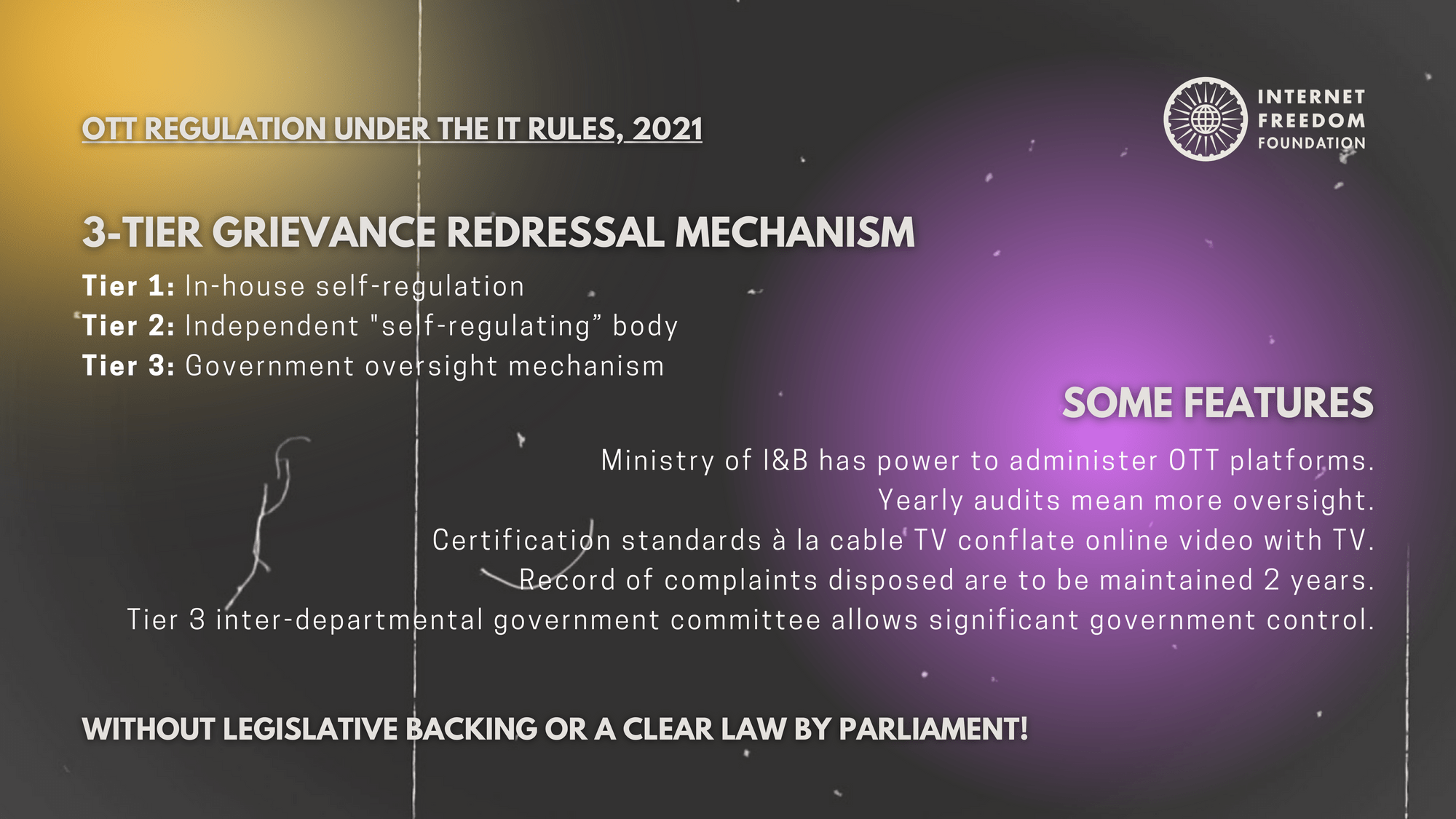 Further, under sub-rule (3) of Rule 8, the Rules lay down a three-tier structure for observance and adherence to the Code which is as follows, “Level I - Self-regulation by the applicable entity”; “Level II - Self-regulation by the self-regulating bodies of the applicable entities”; “Level III - Oversight mechanism by the Central Government.” This oversight mechanism is being created without any clear legislative backing and will now increasingly perform functions similar to those played by the Ministry of Information and Broadcasting for TV regulation. For instance, as per Rule 13(4) this also now includes powers of censorship such as apology scrolls, but also blocking of content!