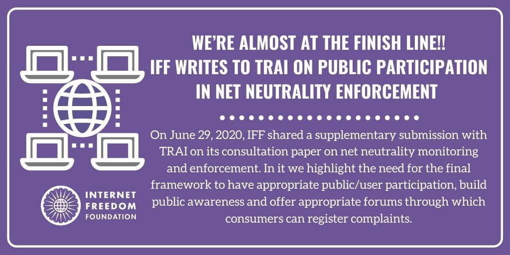 On June 24, 2020 IFF participated in a virtual open house discussion hosted by the Telecom Regulatory Authority of India (“TRAI”) on its ongoing consultation on traffic management practices (“TMPs”) and a multistakeholder body for net neutrality. In it, TRAI offered stakeholders a final opportunity to submit written submissions by June 29, 2020. IFF has taken the liberty to share a supplementary submission, to complement our earlier comments and counter comments. The purpose behind this is to emphasise the regulatory importance of focusing on strong implementation and enforcement; and the centrality of public/user participation.