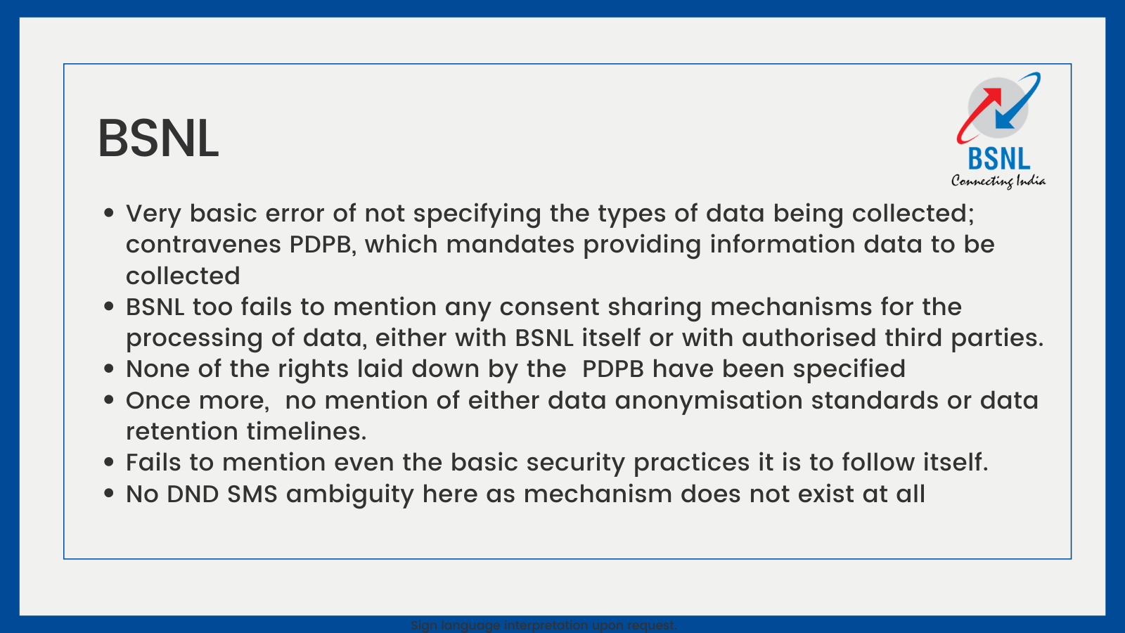 BSNL's privacy policy is perhaps the most antiquated of the four, and thus is most in need of revision. A very basic error the privacy policy commits is that it fails to specify the types of data being collected. This would contravene clause 7(1) of the PDPB, which mandates providing information about the nature and categories of personal data to be collected to the data principal. Like the other TSP, BSNL fails to mention any consent sharing mechanisms for the processing of data, either with BSNL itself or with authorised third parties. Across various service providers, this is quite a large lacuna that must be addressed immediately.