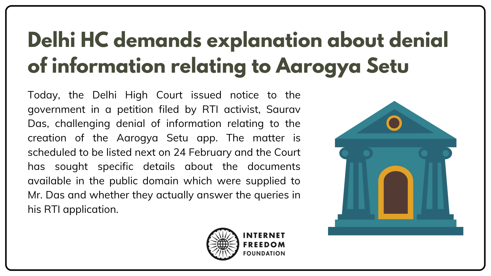 Today the Delhi High Court issued notice to Public Information Officers of DeitY, MeitY, NeGD and NIC in a writ petition filed by RTI activist and independent journalist, Saurav Das. The petition challenged the Central Information Commisison’s refusal to grant Mr. Das a hearing prior to disposing of his complaint based on the government's misleading claim that the information sought by him regarding the creation of the Aarogya Setu app was already available in the public domain.
