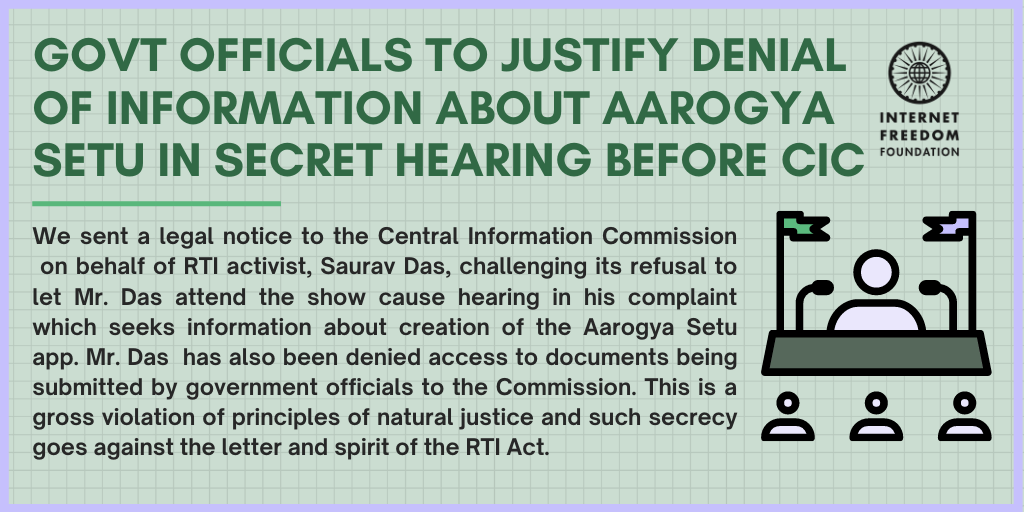 Last week, we sent a legal notice to the Central Information Commission on behalf of RTI activist and independent journalist, Saurav Das. The legal notice challenges the CIC's refusal to let Mr. Das attend the show cause hearing in his complaint which seeks action against government officials who claim to have no information about the creation of the Aarogya Setu app . The show cause hearing is scheduled for November 24, 2020 i.e. tomorrow and government officials from MeitY, NeGD and NIC have been summoned to explain why they should not be penalized under the RTI Act for obstructing access to information by providing evasive replies. Denying a complainant the right to attend proceedings in his own case is a gross violation of principles of natural justice and such actions go against the letter and spirit of the RTI Act.