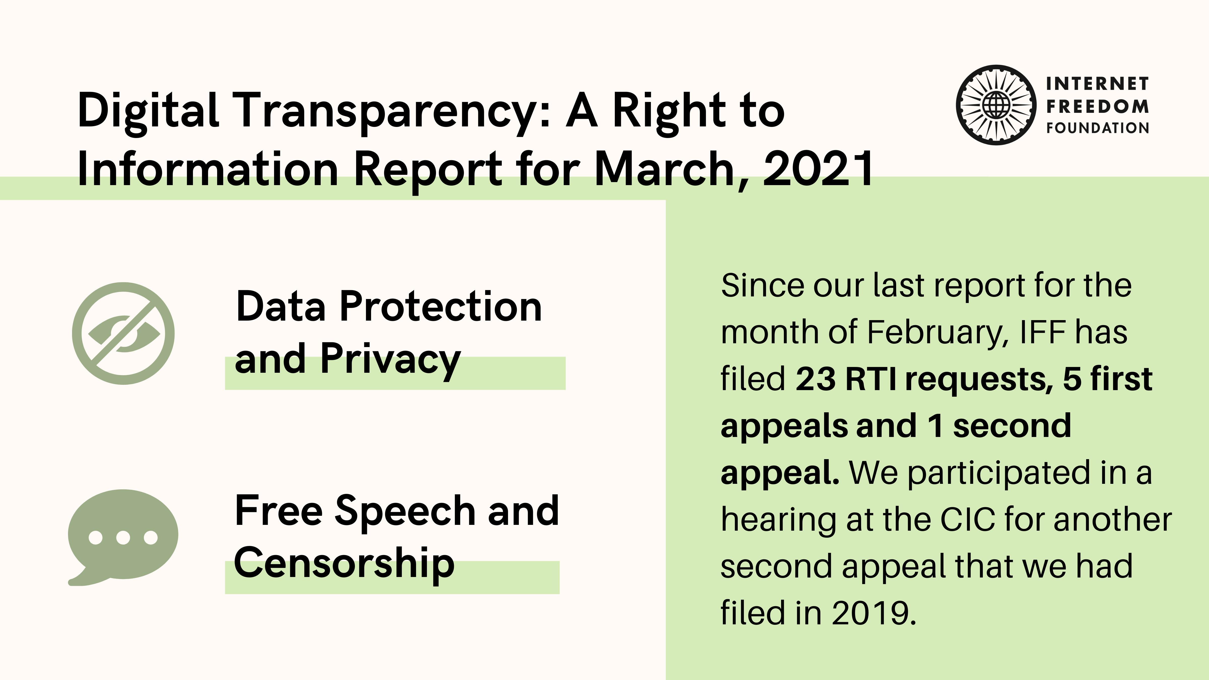 Since our last report in the month of February, IFF has filed 23 RTI requests, 5 first appeals and 1 second appeal. . Here, we give you an overview of the requests filed and why demanding transparency from government authorities is one of the key elements in our fight to protect digital rights.