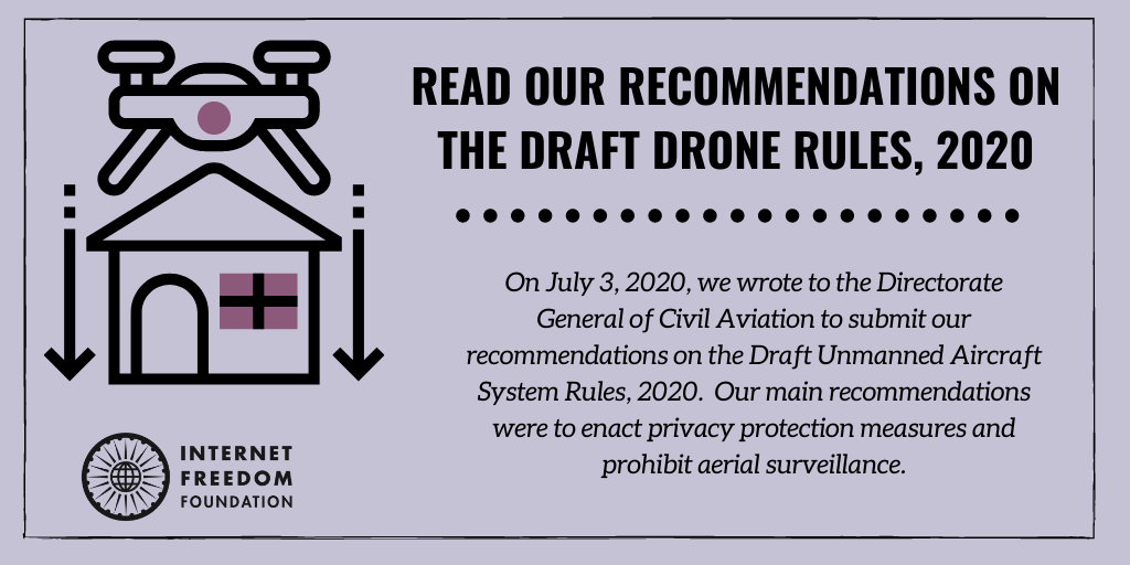 We wrote to the Directorate General of Civil Aviation (DGCA) providing them with certain recommendations for the Draft Unmanned Aircraft System Rules, 2020 which were made public for consultation on June 2, 2020. Our main recommendations were the inclusion of certain privacy protecting measures in the rules regulating aerial photography and the introduction of a new rule which would prohibit aerial surveillance for law enforcement purposes.