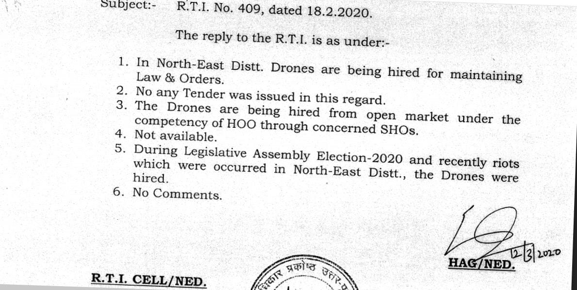 Our request was transferred to various departments of the Delhi Police. We received replies from multiple departments denying any use of drones by them. However, in a reply dated March 13, 2020, the Public Information Officer (PIO) of the North-East District, Seelampur, Delhi Police confirmed that they have been using drones.