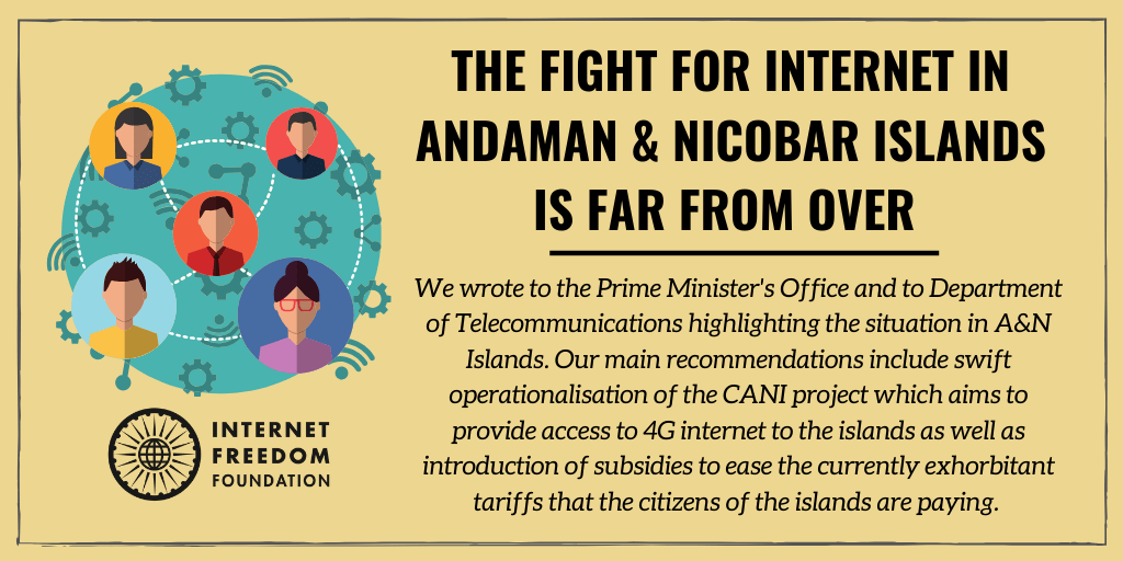 In our previous blogpost on the issue, we highlighted the difficulties which the people of Andaman & Nicobar Islands are facing with regard to being unable to access high-speed 4G internet. As a next step, we have written to the Prime Minister’s Office and the Department of Telecommunications highlighting the prevalent issues and providing certain recommendations. The main recommendations include the swift operationalisation of the CANI Project by the USOF division as well as providing the people of the islands with subsidies to ease the exorbitant tariffs that they are paying currently.